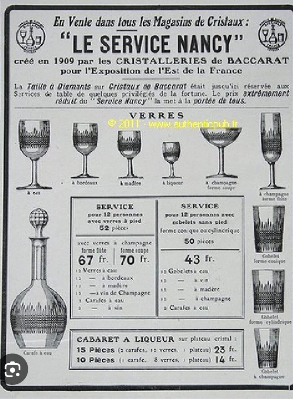 Belle série de 12 verres à eau Baccarat modèle Nancy. Les grands verres sont difficiles à trouver . Non signés, antérieurs à 1936.. modèle créé en 1867.,ce modèle fut présenté à la foire internationale de Nancy de 1908. Ligne pure et motif taillé en pointes de diamants biseautées