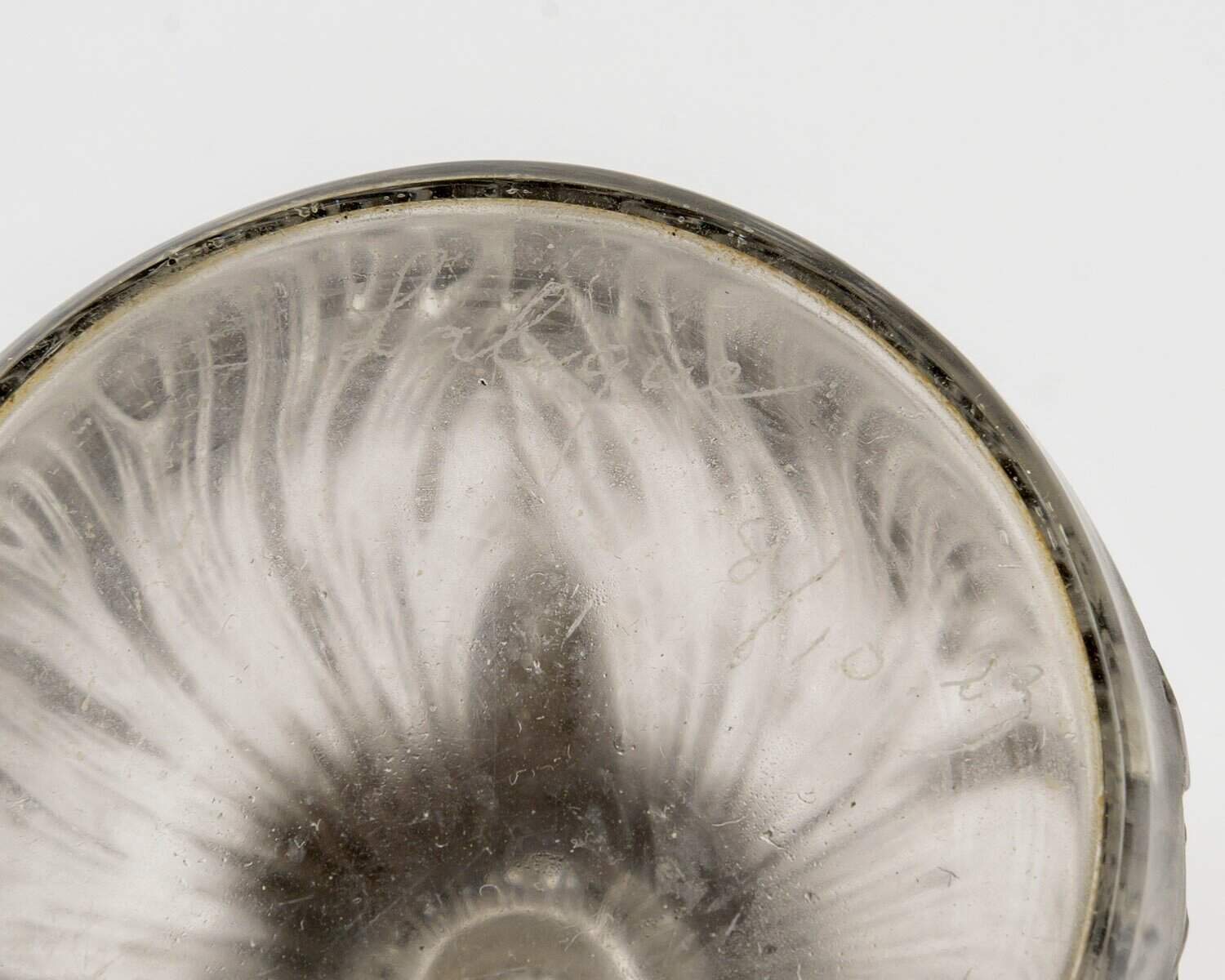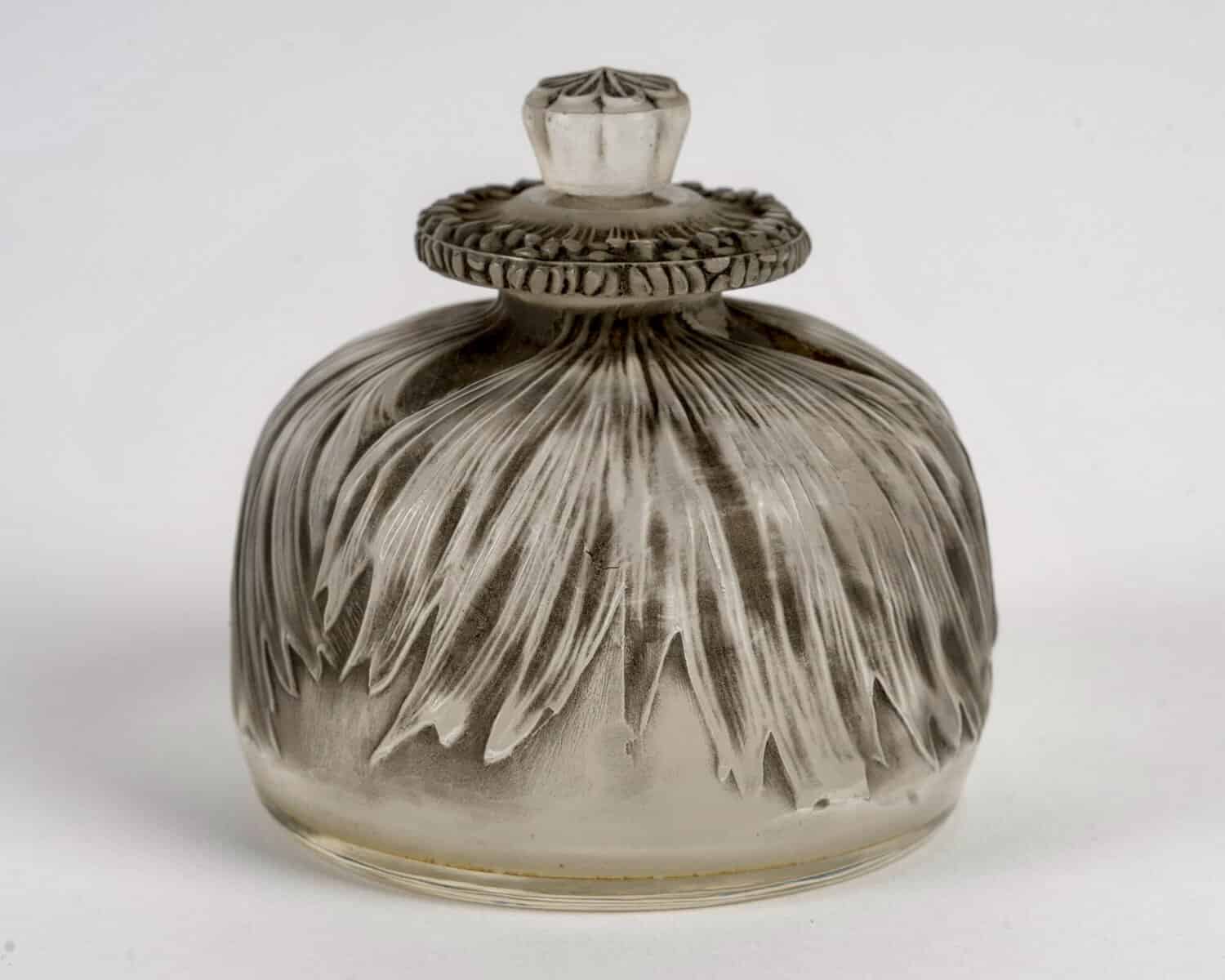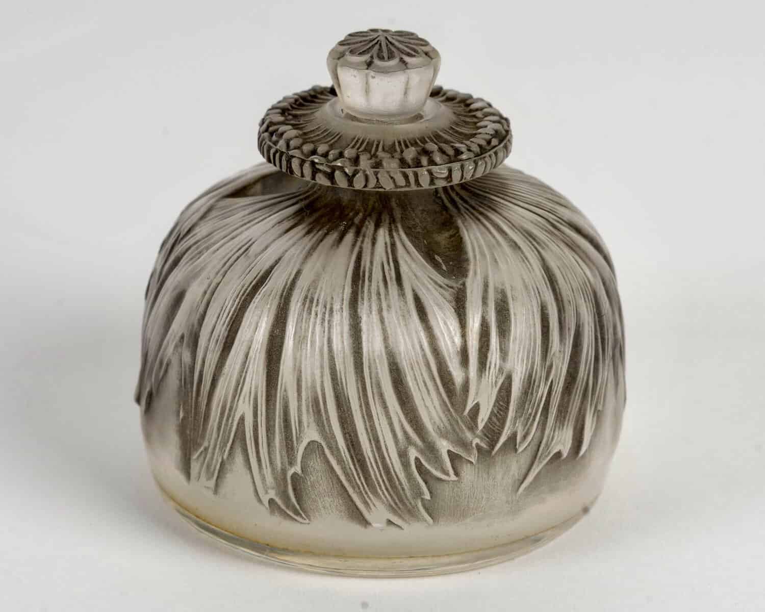 Flacon à Parfum « Pavot » en verre blanc patiné gris créé par René Lalique en 1910.
