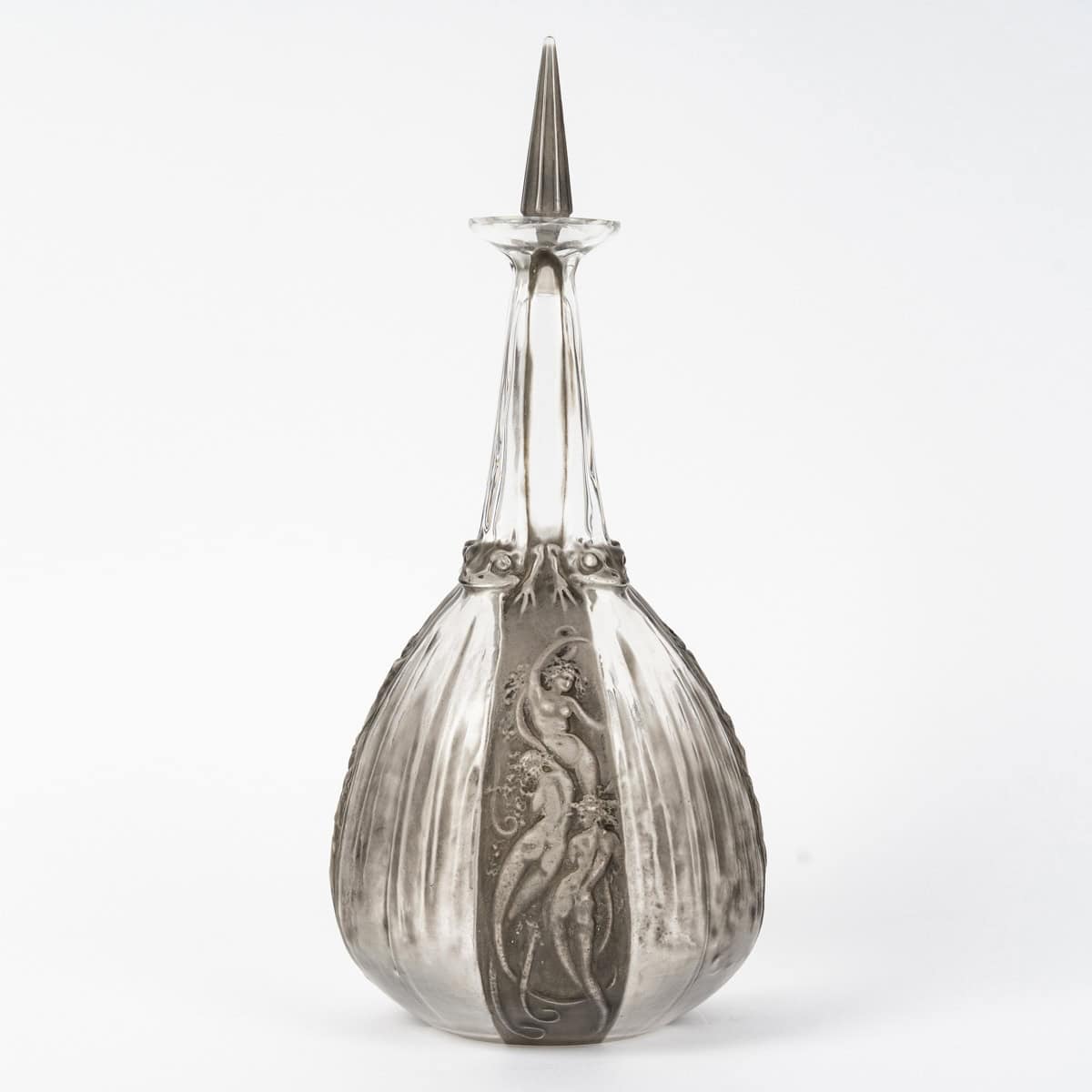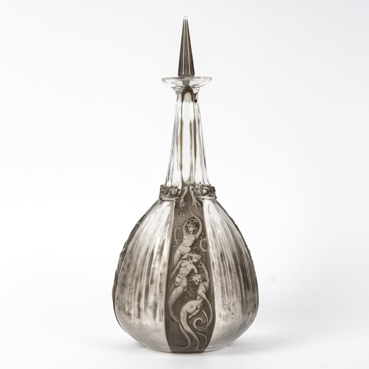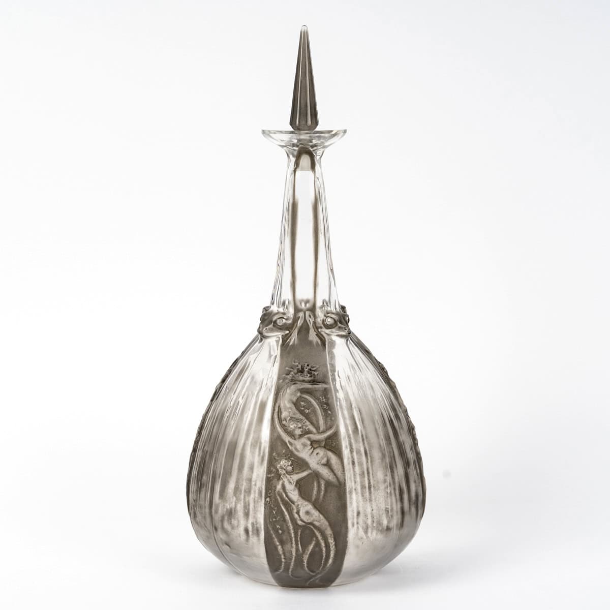 Carafe « Sirènes et Grenouilles » en verre blanc patiné gris de René Lalique créé en 1911.
