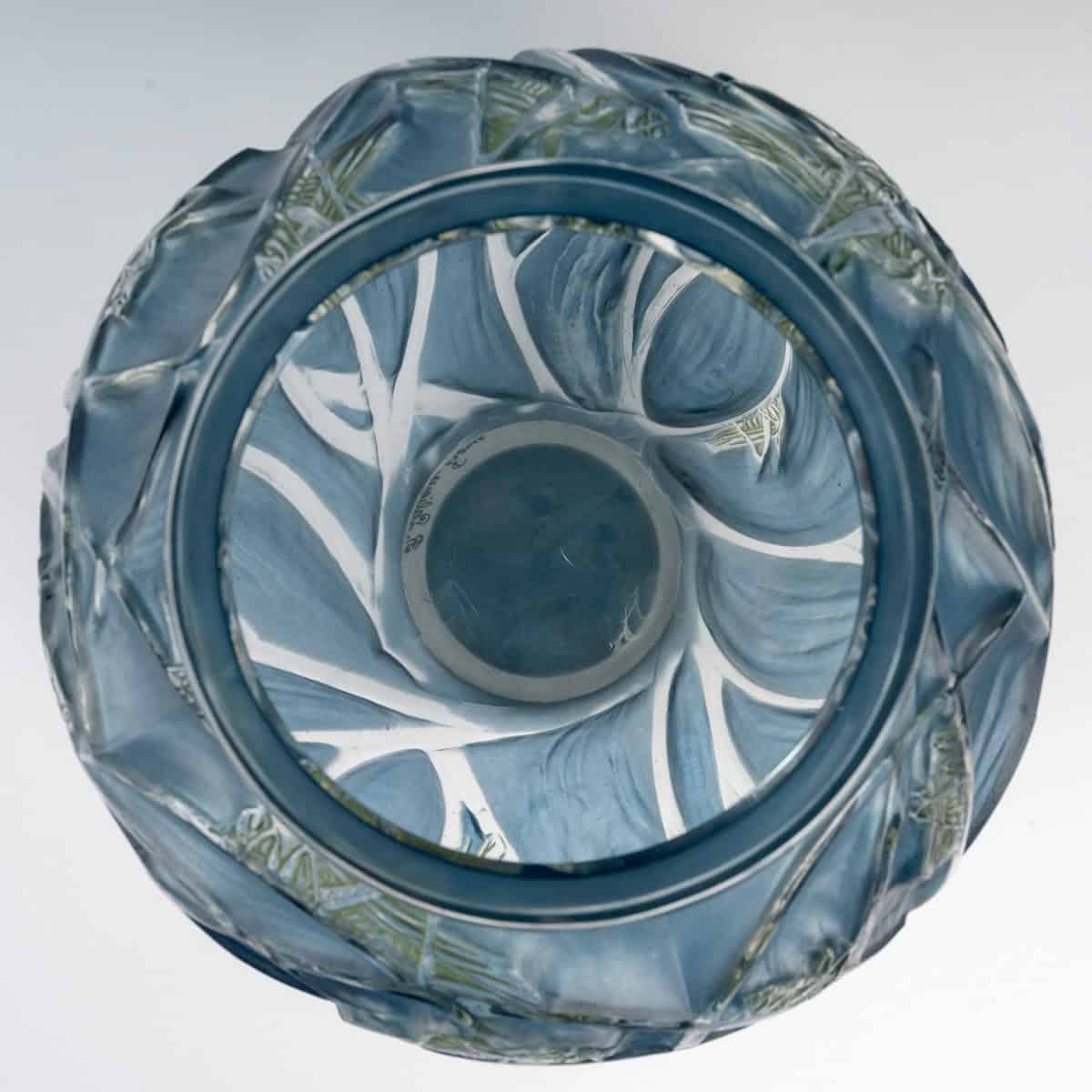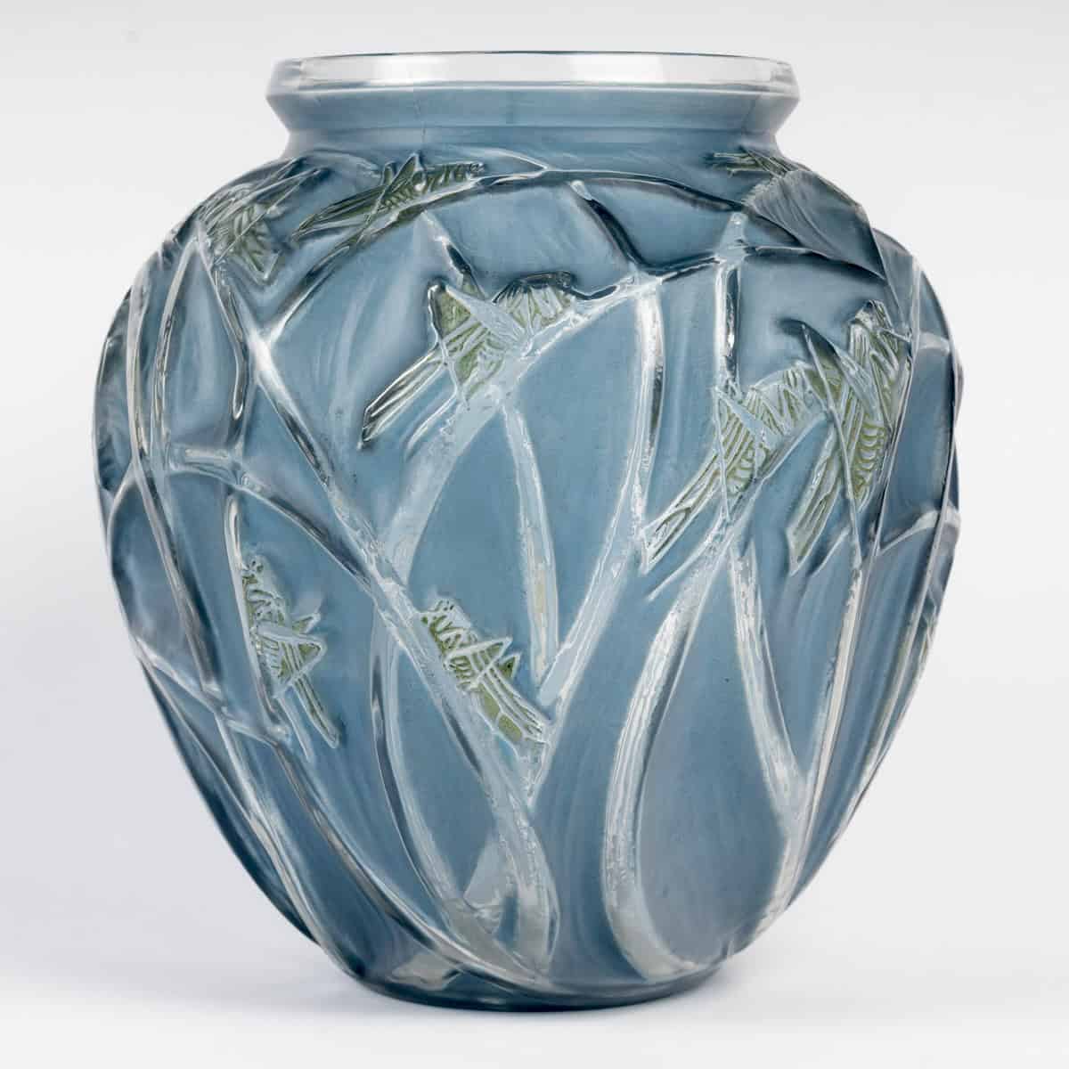 Vase « Sauterelles » en verre patiné bleu et vert de René Lalique créé en 1912.