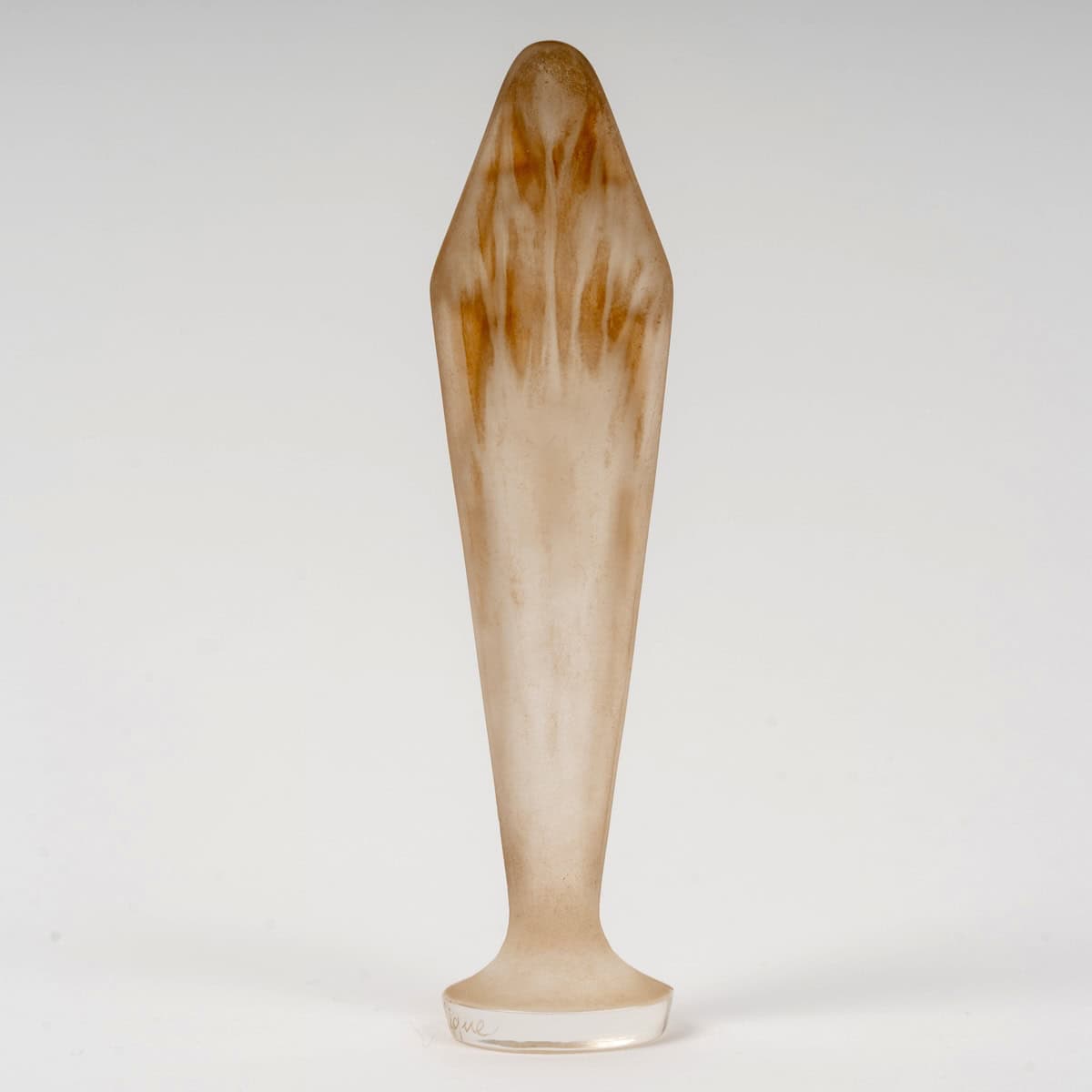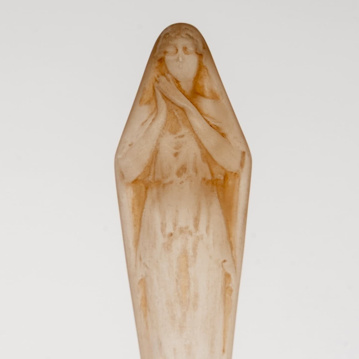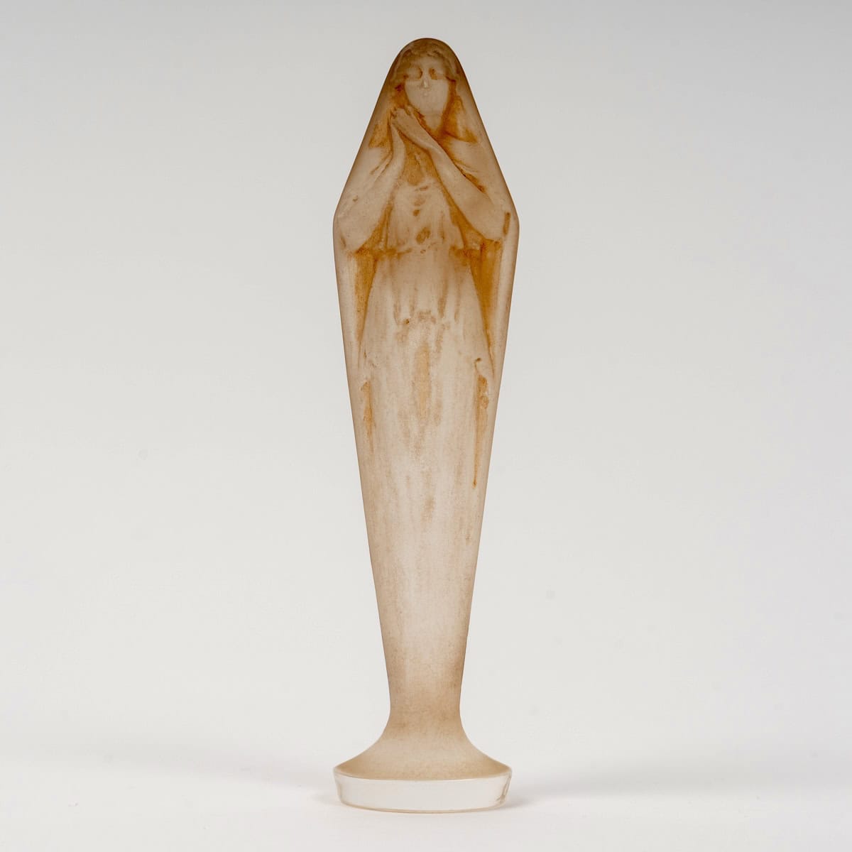 Cachet « Figurine Mains Jointes » en verre blanc patiné sépia de René Lalique créé en 1920.