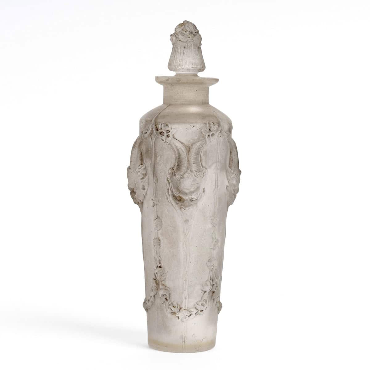 Flacon à Parfum « Pan » en verre blanc patiné gris de René Lalique créé en 1920.