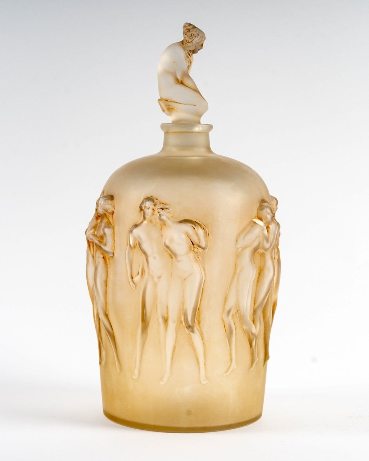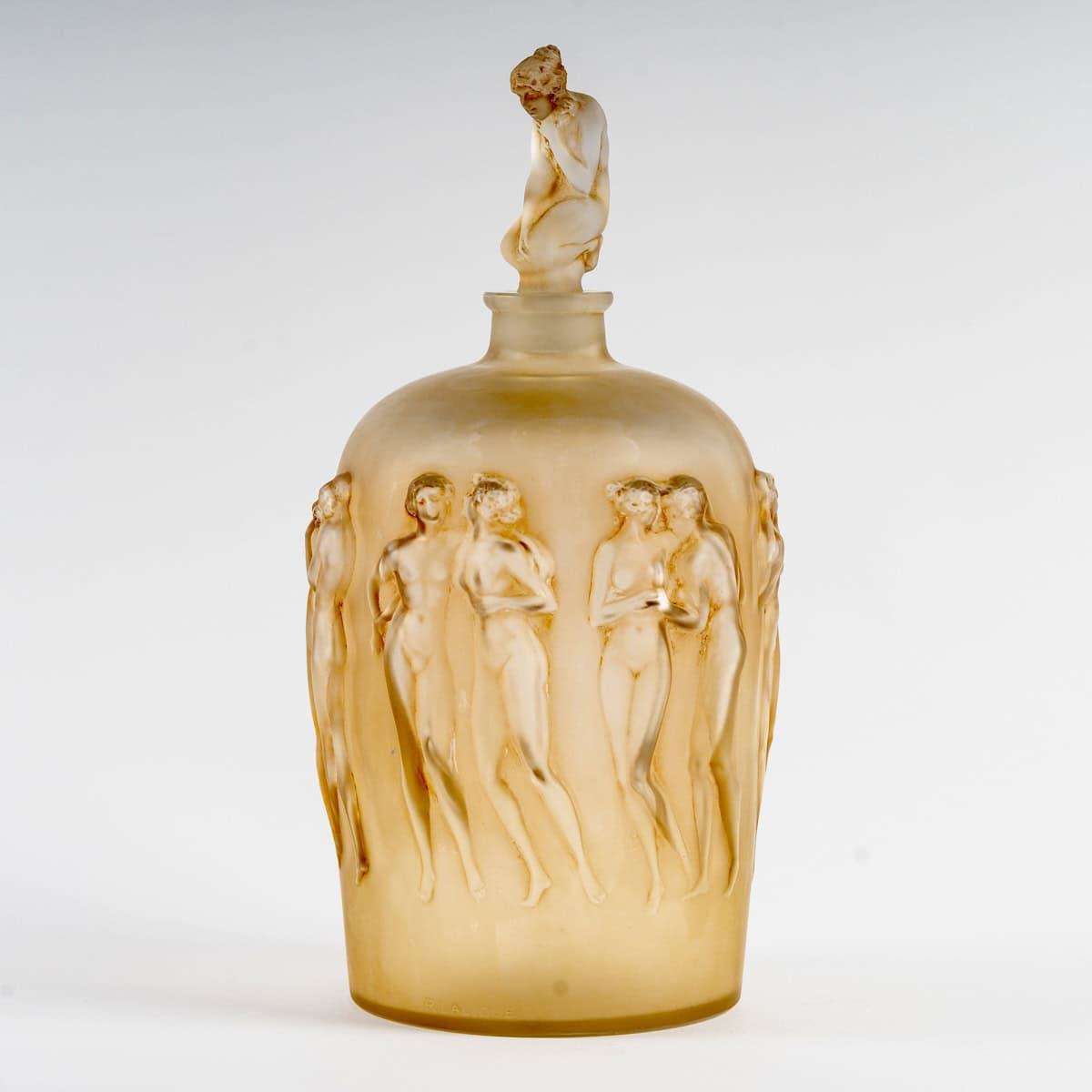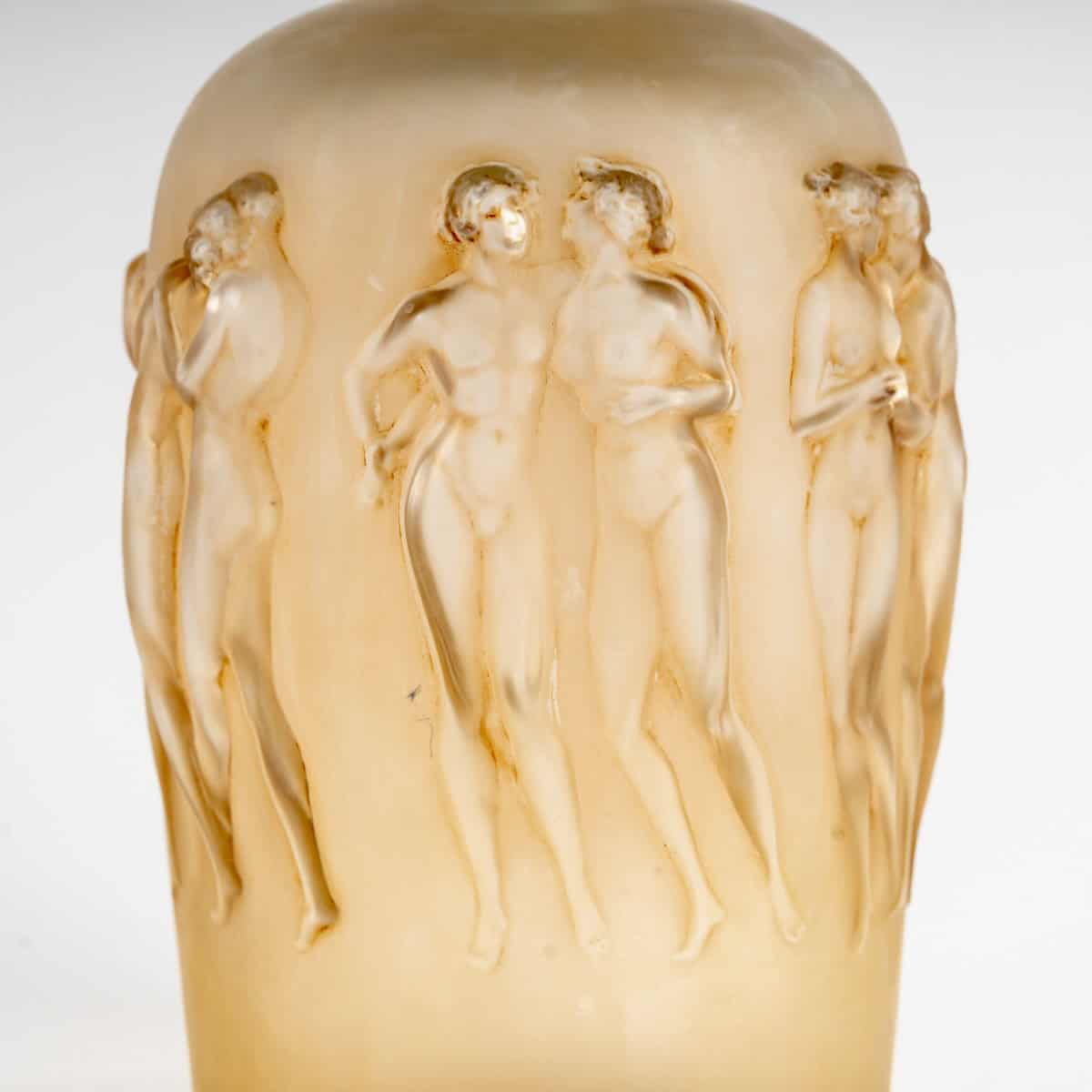 Vase « Douze Figurines avec Bouchon Figurines » en verre blanc patiné sépia de René Lalique créé en 1920.