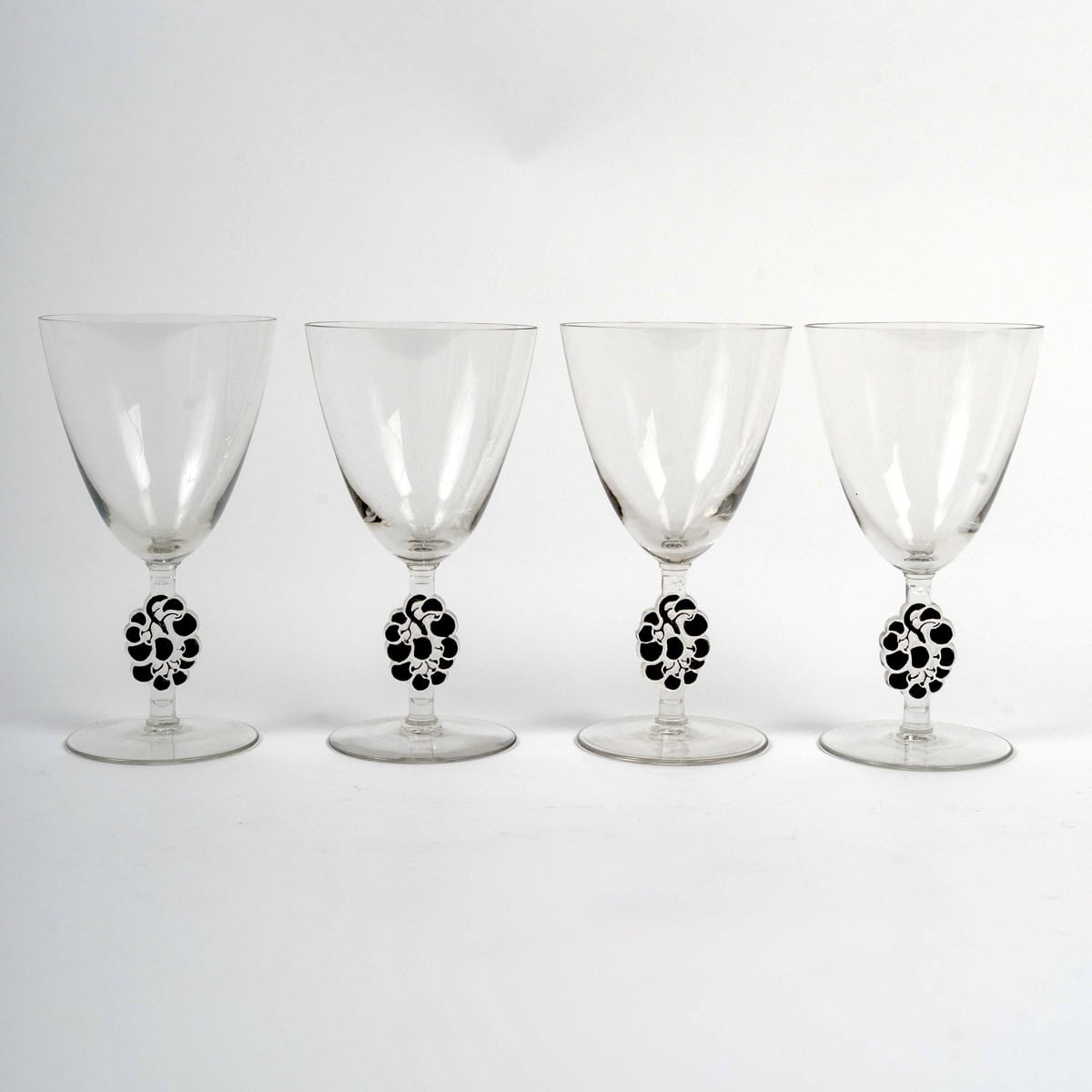 Suite de 4 verres à eau « Thionville » en verre blanc émaillé noir d’origineà chaud de René Lalique créés en 1924.