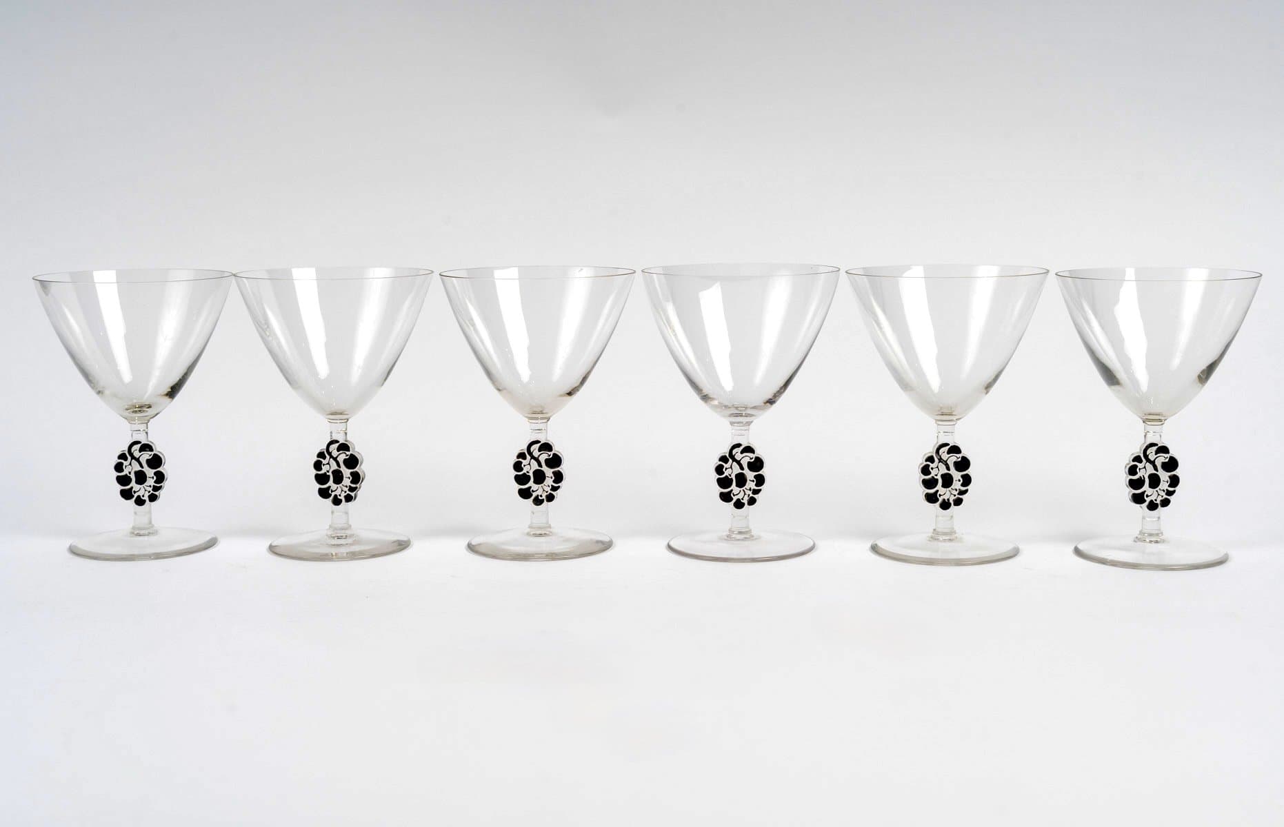Suite de 6 coupes à champagne « Thionville » en verre blanc émaillé noir d’origine à chaud de René Lalique créés en 1924.