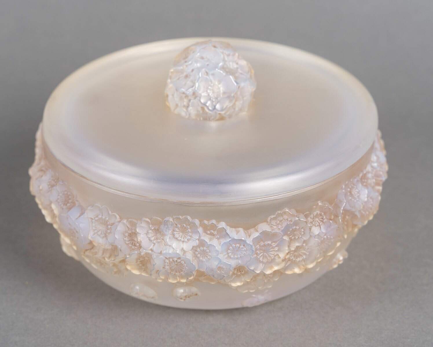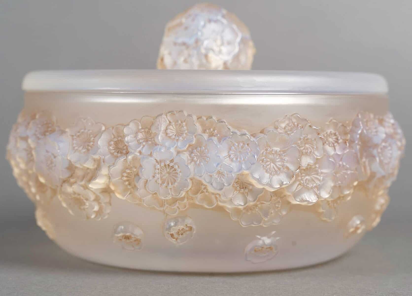 Boîte « Primevères » en verre opalescent patiné sépia de René Lalique créée en 1927.