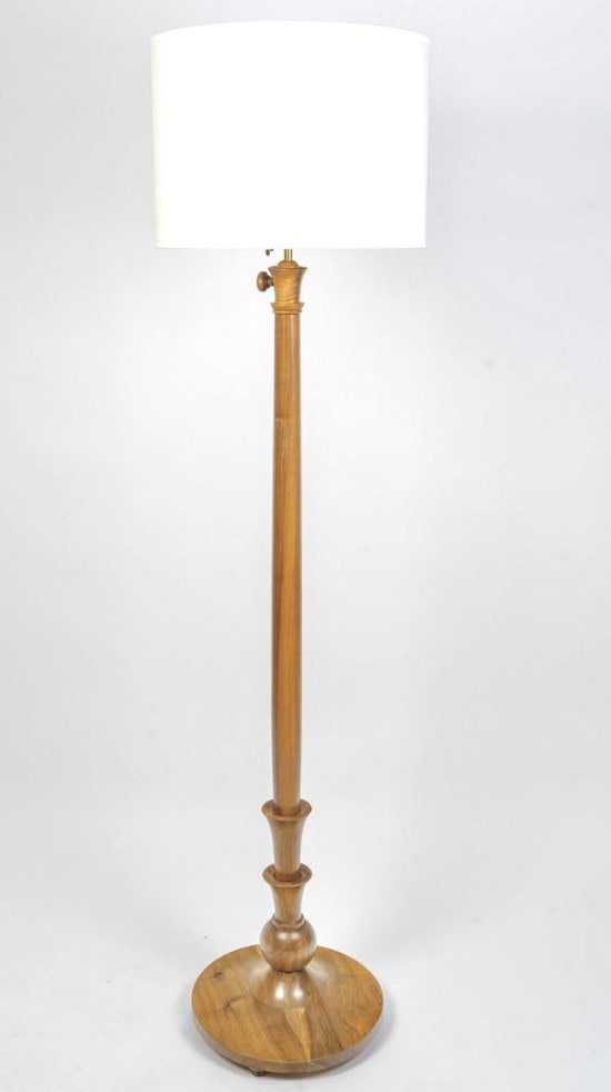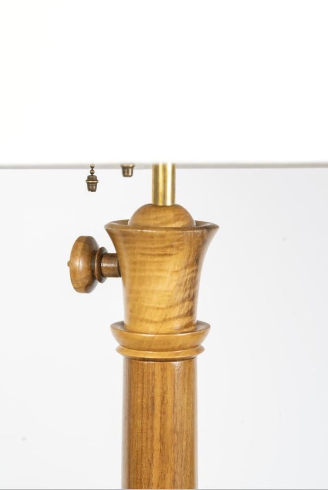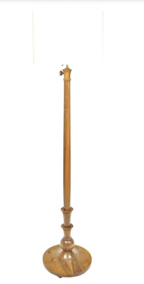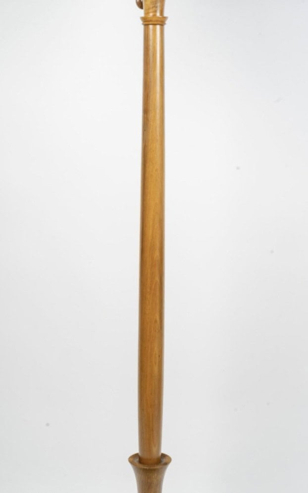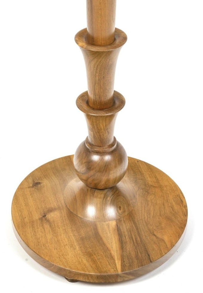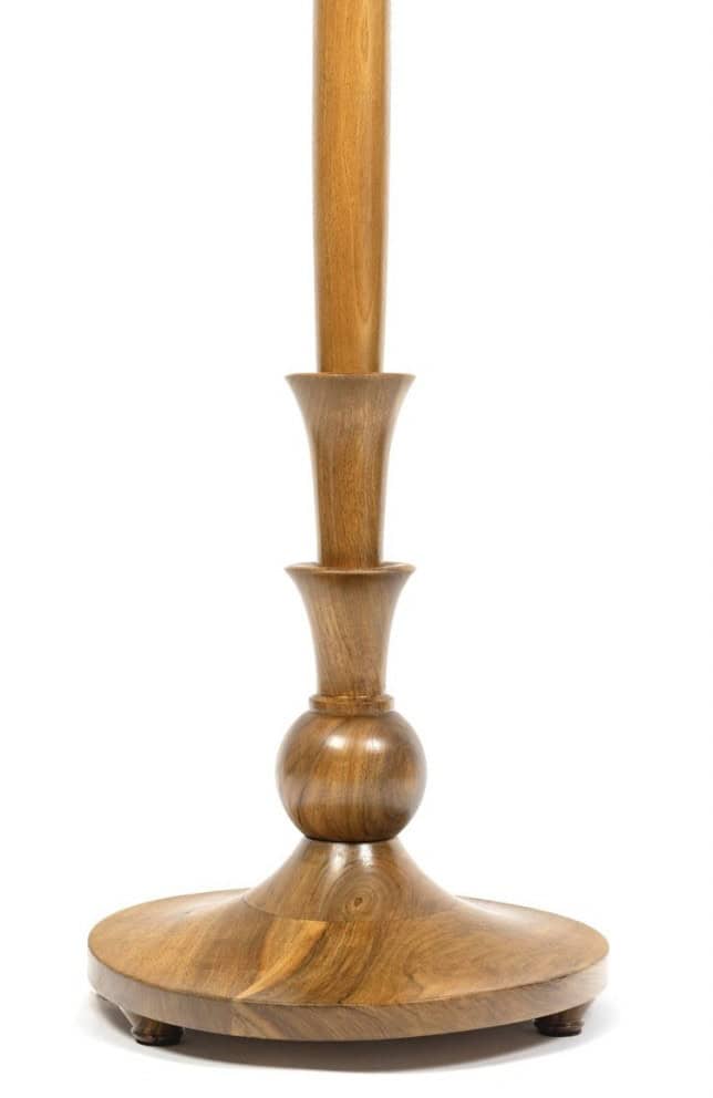 Composé d’une large base oblongue reposant sur un piédestal rond légèrement incurvé vers l’extérieur et vers l’intérieur au centre. À la base du pied se trouve une sphère surmontée de deux chapiteaux en bois sculpté. Au sommet du pied, la décoration en forme de chapiteau se répète, juste au-dessus de laquelle une demi-sphère soutient la tige en laiton qui maintient l’abat-jour. Sur le côté, une clé en bois sculptée à la main permet de régler la hauteur de l’abat-jour.