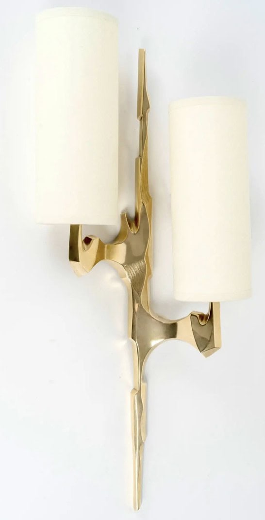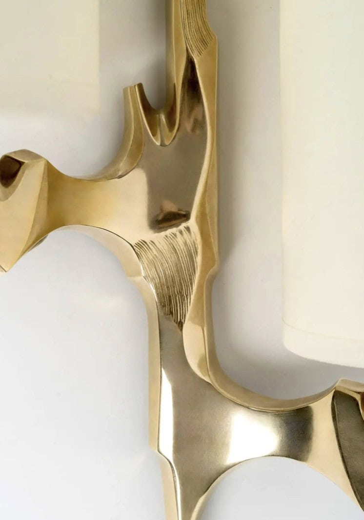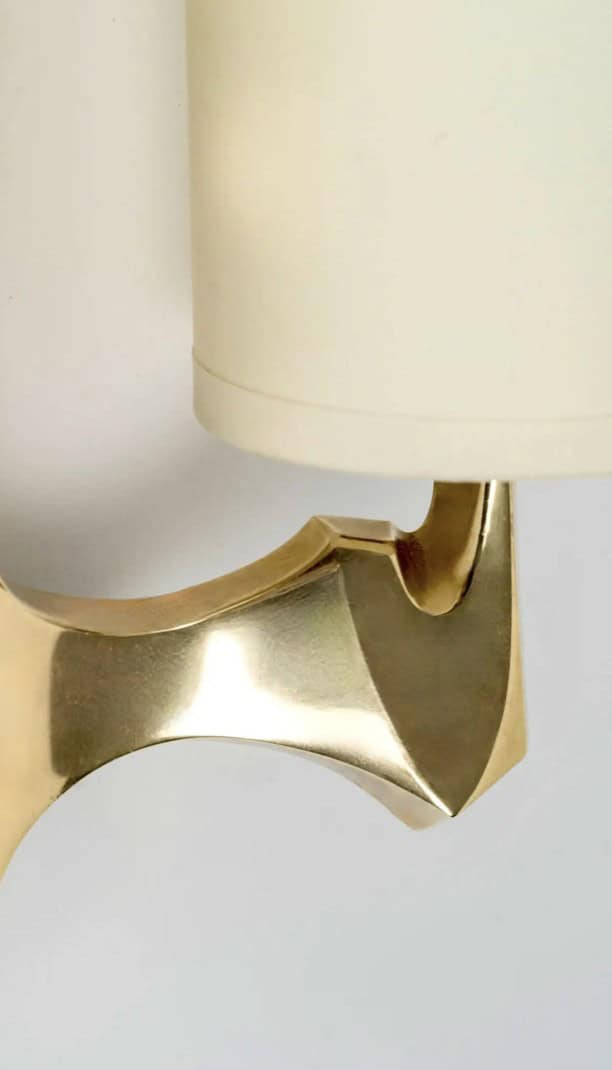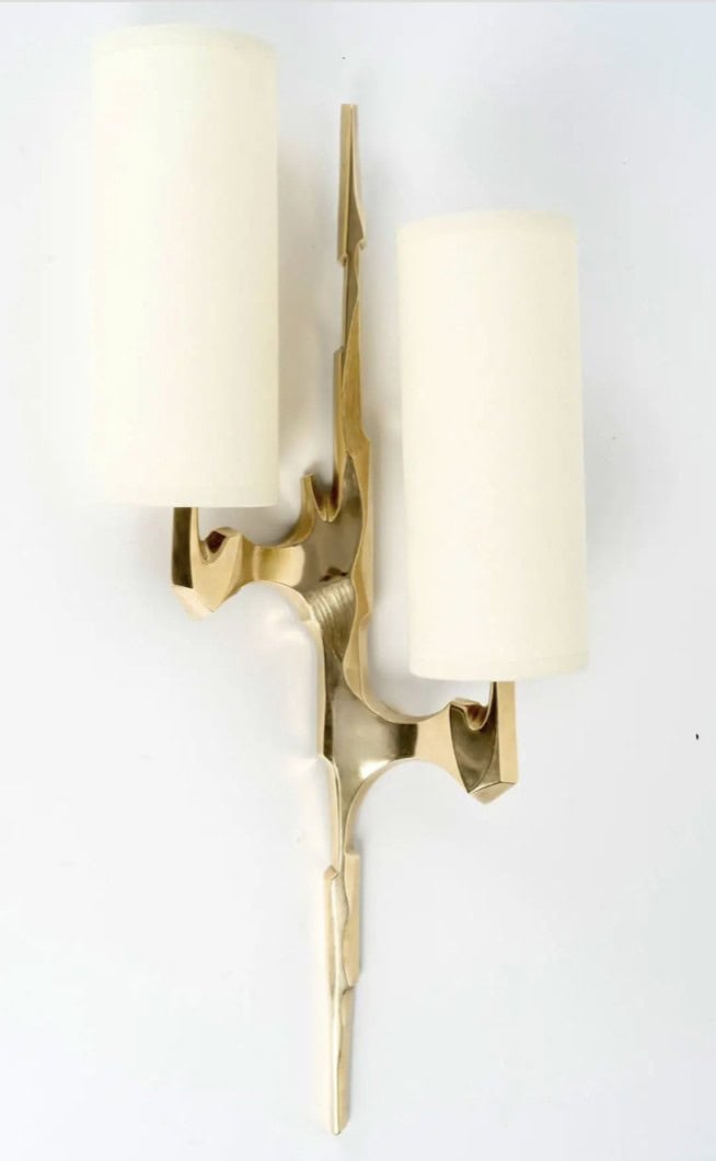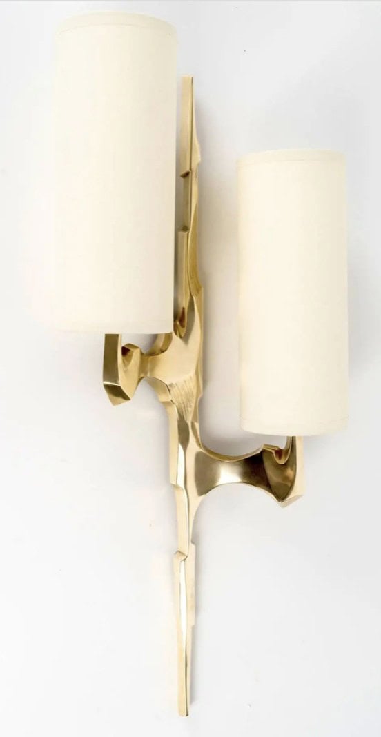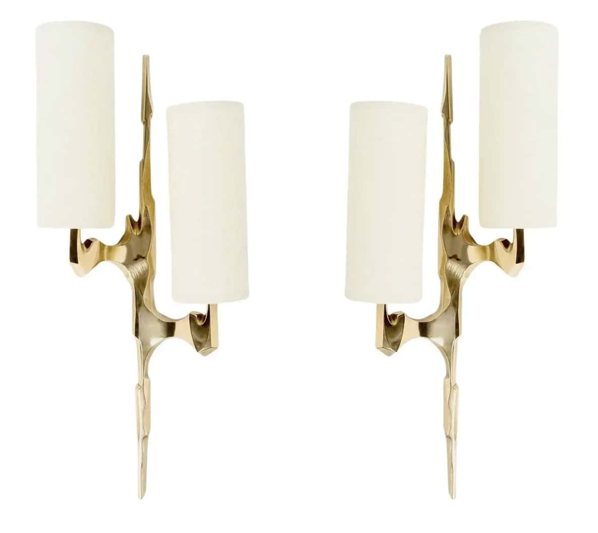 La paire d’appliques en bronze doré s’inspire des branches d’arbres. Chaque applique se compose d’un bras central sur lequel deux bras sont positionnés de part et d’autre de l’applique à deux hauteurs différentes. Les deux bras sont recouverts d’abat-jour cylindrique refait à l’identique.