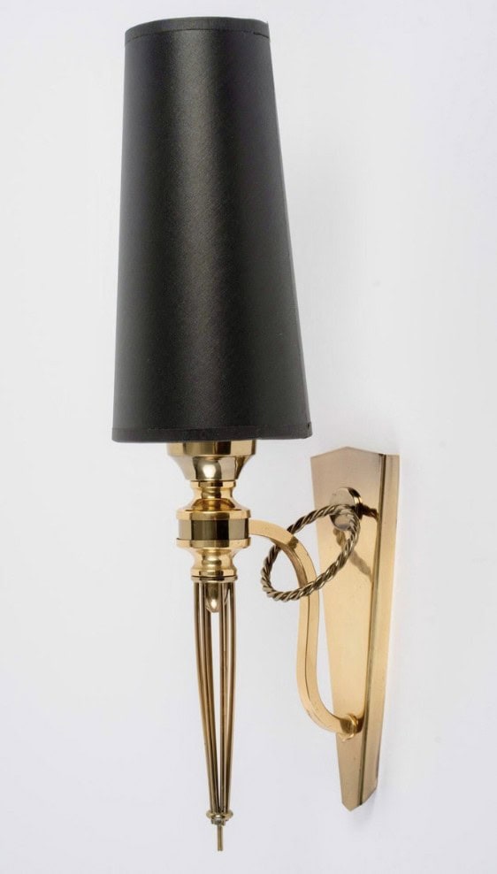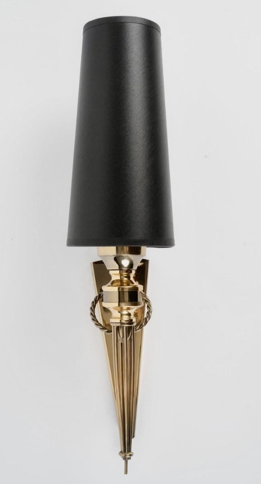 En haut, un abat-jour trapézoïdal en coton noir avec un intérieur doré orne l’applique murale, souligné par une coupelle cylindrique en laiton doré.