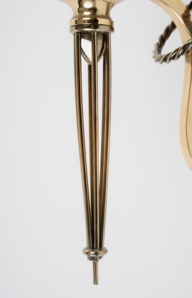 Dans sa partie inférieure, le bras de lumière forme une tige ajourée composée de fines tiges en laiton doré décorées à l’intérieur de la partie supérieure d’une demi-sphère allongée et assemblées dans la partie inférieure par un petit anneau souligné par une fine pointe, le tout en laiton doré.