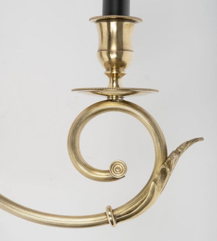 Chaque bras forme une demi-boucle sur laquelle repose une grande bougie laquée noire, embellie d’un petit bassin à sa base.