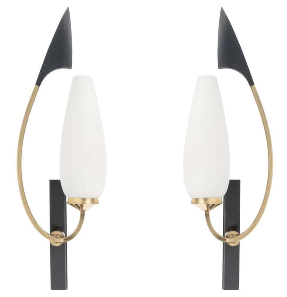Composées d’une plaque murale rectangulaire noire sur laquelle repose un petit bras soutenant une tige en laiton doré de section carrée recourbée vers le haut. D’un côté, elle s’élève et est décorée à son sommet d’une flèche noire stylisée ; de l’autre côté, elle soutient le bras lumineux formé par une opaline ovoïde.