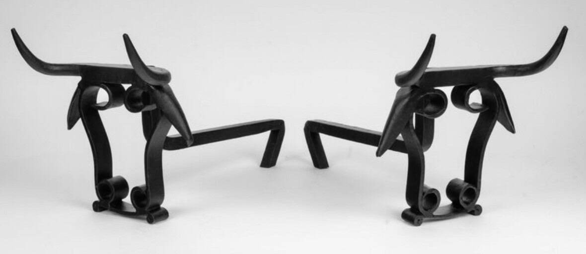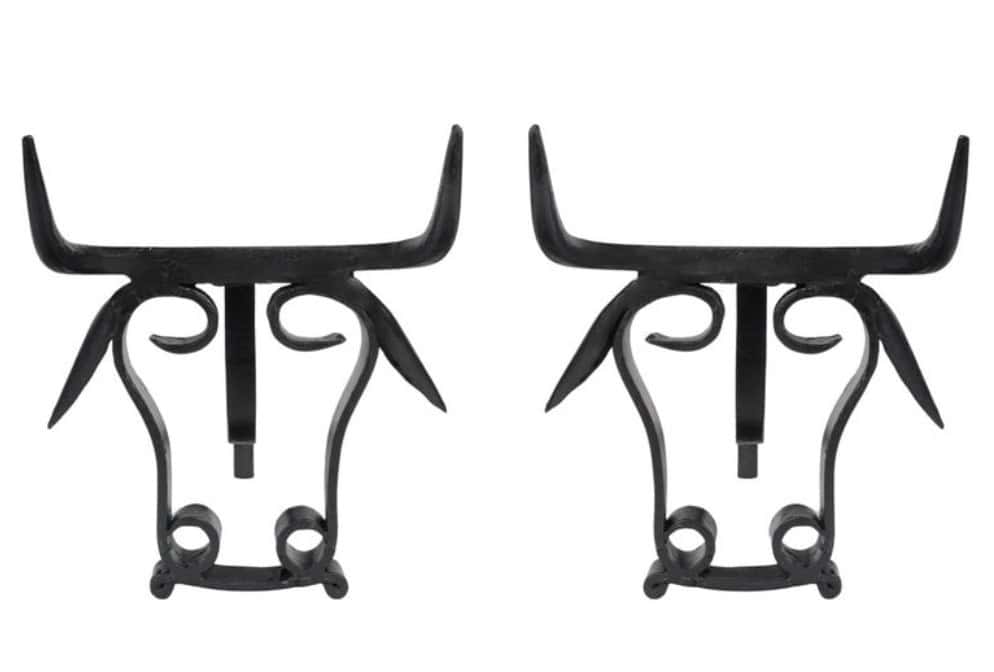 Paire de chenets en fer forgé en forme de tête de taureau.