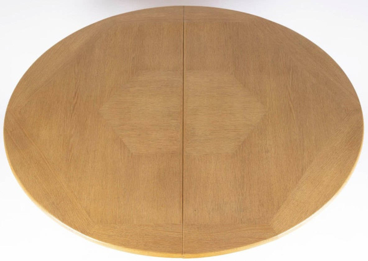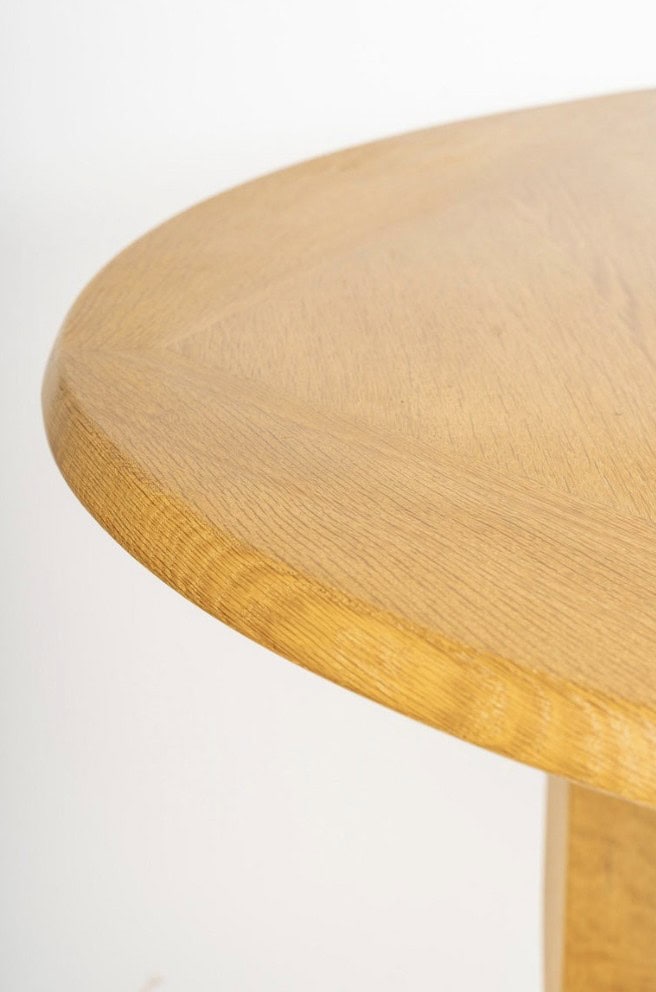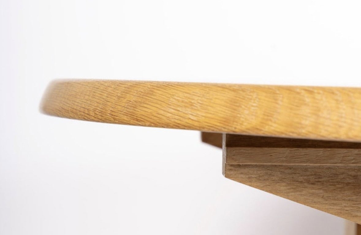 Composée d’un plateau en chêne blond massif assemblé selon un motif géométrique, reposant sur 4 pieds avec traverses se terminant par des pieds boules.