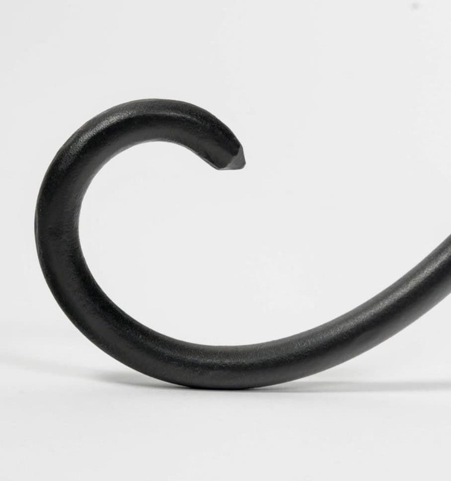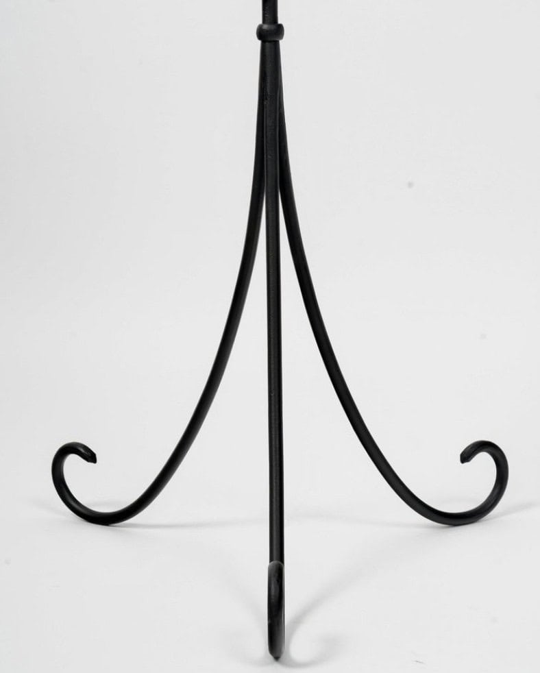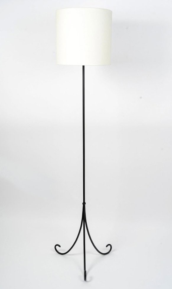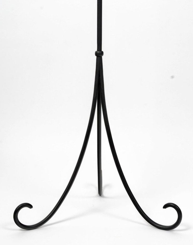 Élégant lampadaire composé d’une tige centrale ronde en fer forgé noir reposant sur un élégant trépied maintenu en place par un anneau se terminant par de jolies demi-boucles incurvées vers le haut.