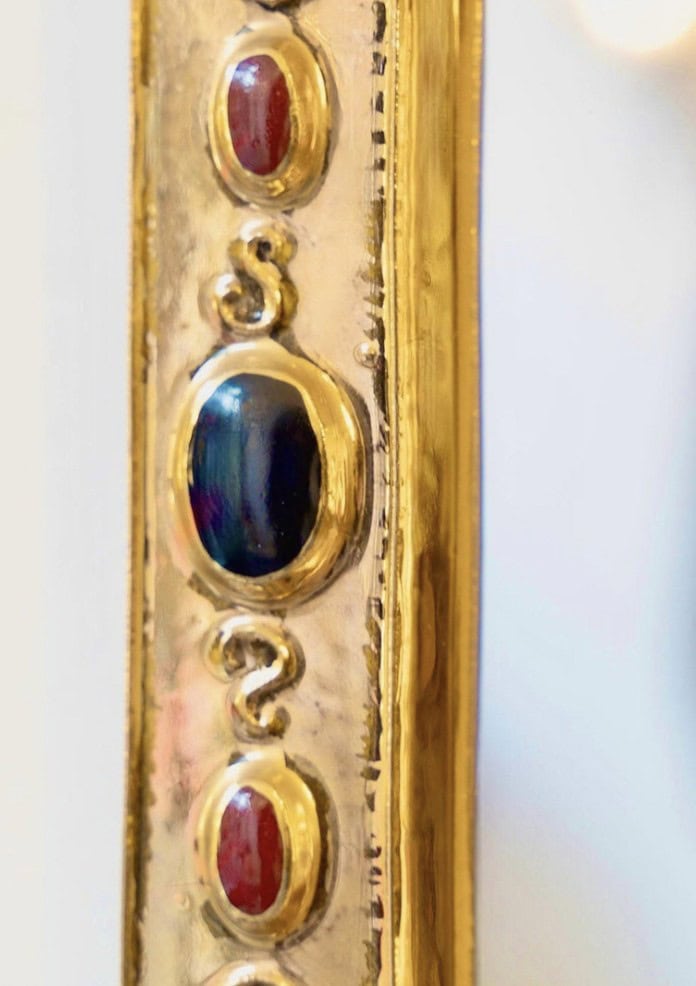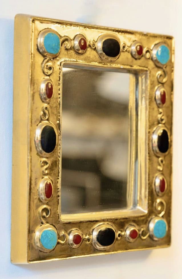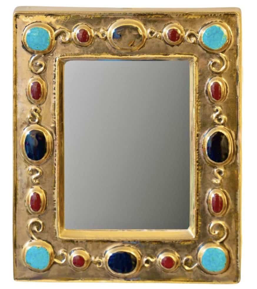 1960 Miroir en céramique dorée imitant des bijoux intégrés, signé François Lembo
