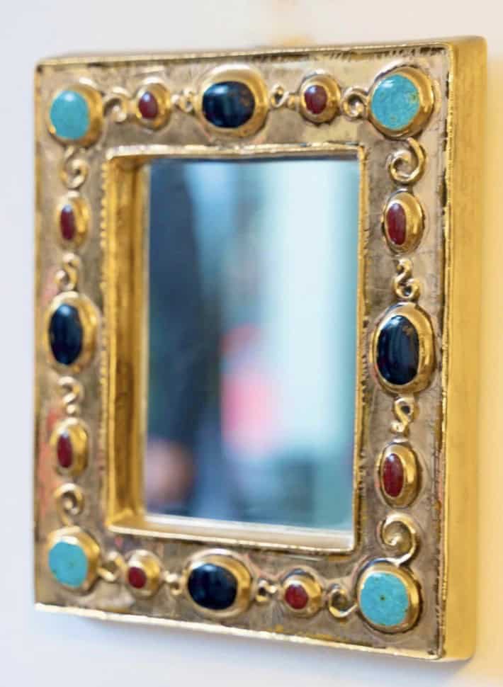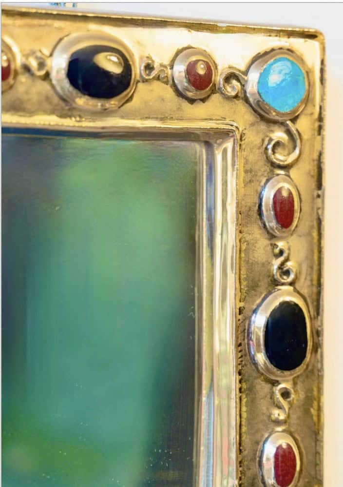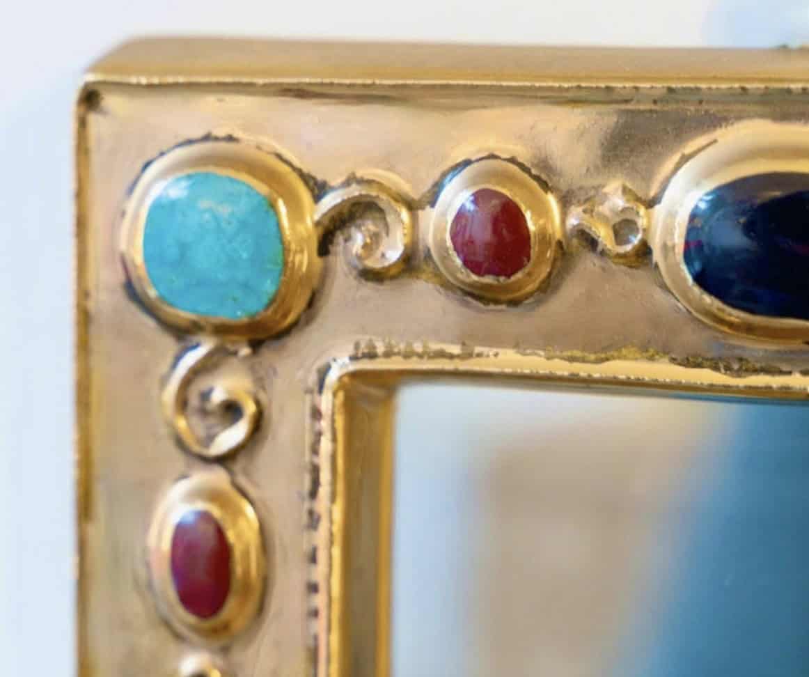 Petit miroir rectangulaire, émail doré, avec décor incrusté imitant des bijoux vert émeraude, noir et rubis, signé.