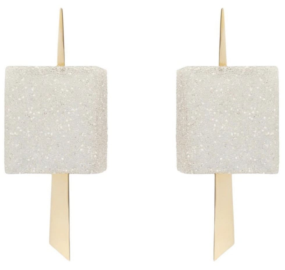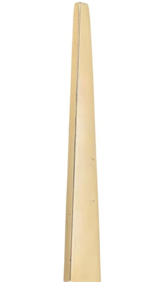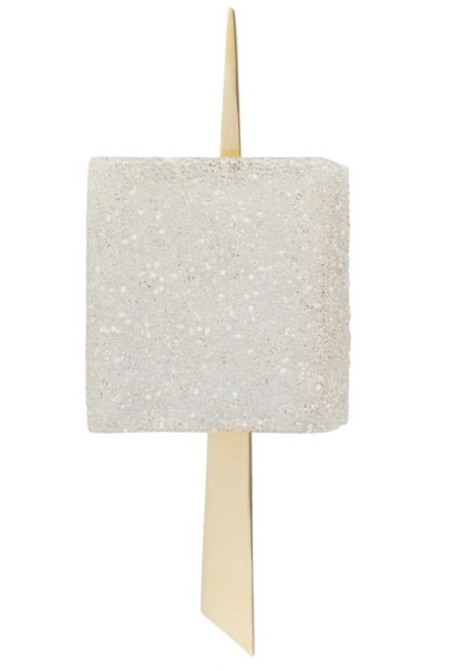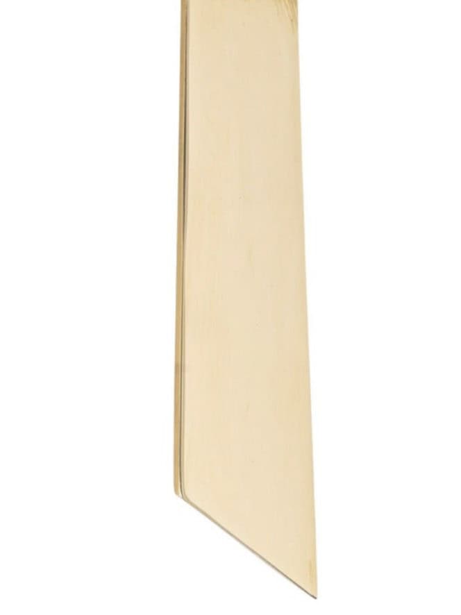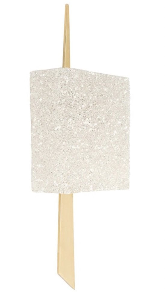 L’applique se compose d’une plaque haute et pointue en laiton doré, ornée en son centre d’un bras lumineux recouvert d’un abat-jour en plexiglas en forme de bandeau.