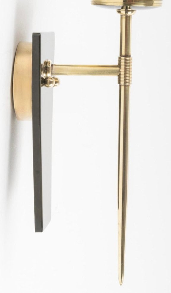 À l’avant, un petit bras soutient une tige pointue en laiton doré à son extrémité inférieure.