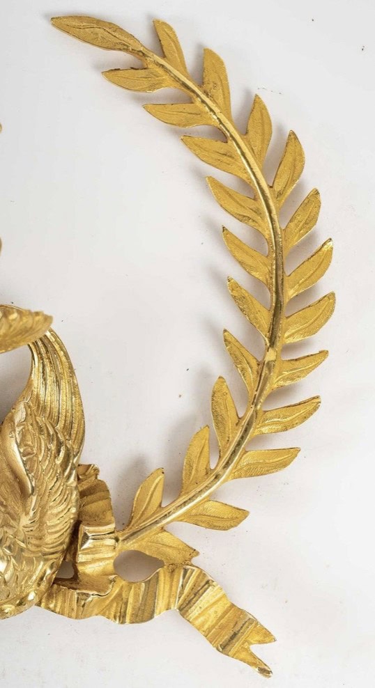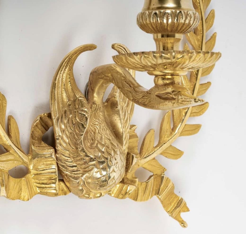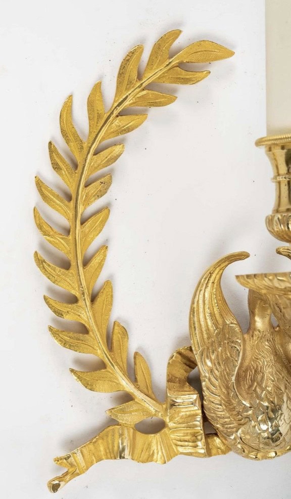 Composées de deux feuilles de laurier en forme de couronne se rejoignant dans leur partie inférieure et ornées d’un cygne soutenant le bras de lumière situé à leur sommet.