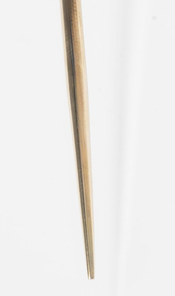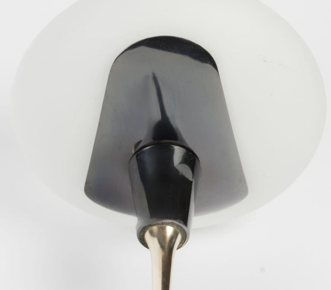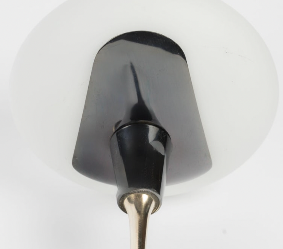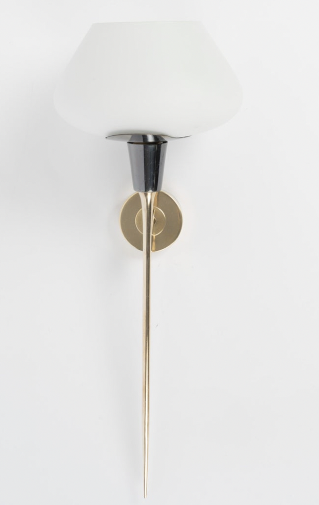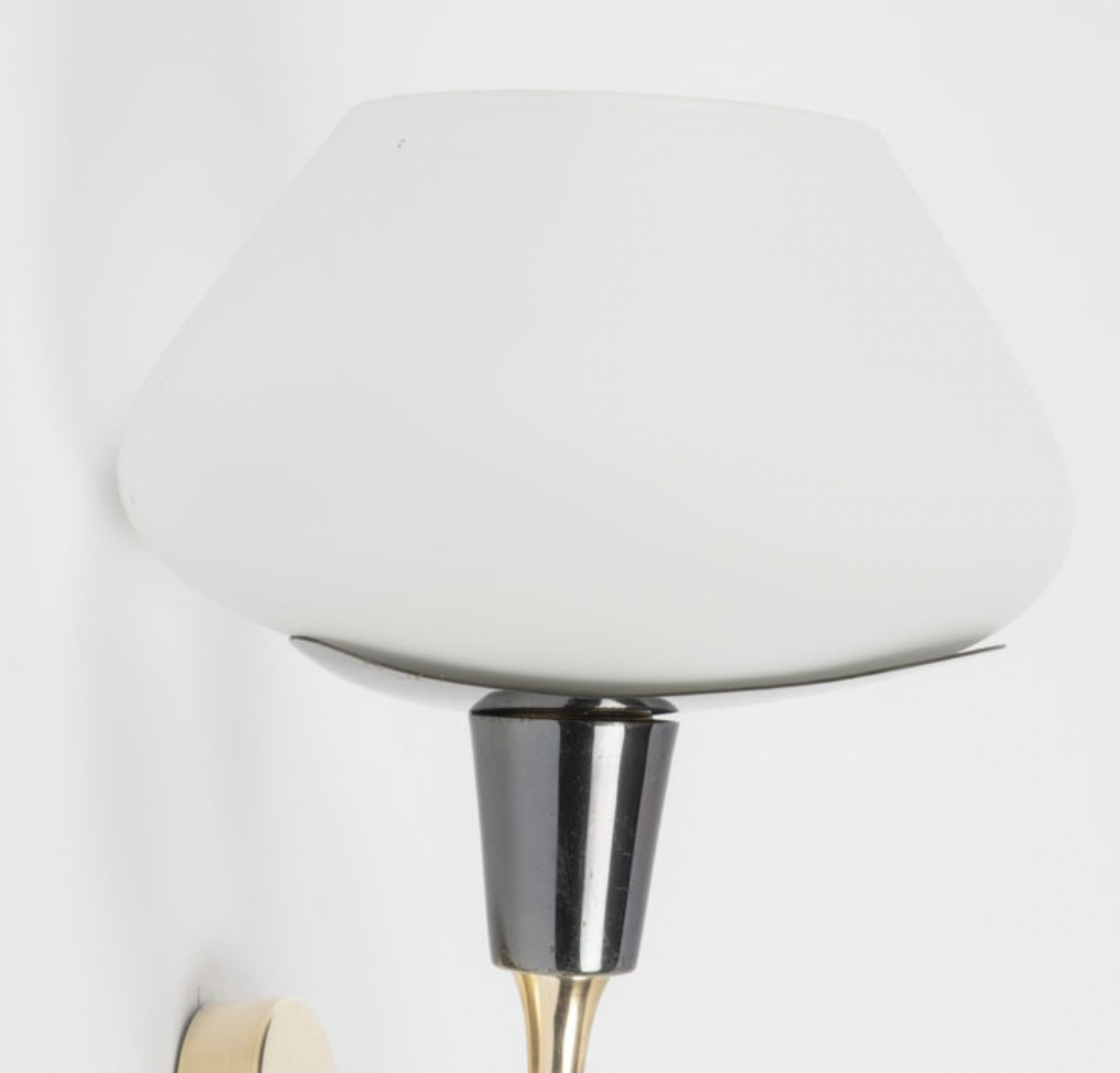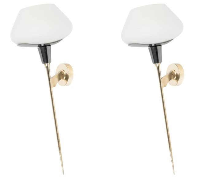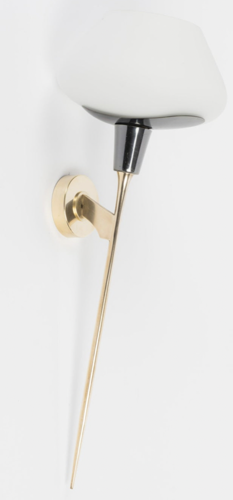 Composées d’une base murale ronde soutenant une longue tige en laiton doré se terminant en pointe dans le bas, elles sont surmontées d’un grand verre opalin d’origine en forme de toupie et mises en valeur par une base asymétrique en laiton patiné couleur bronze.