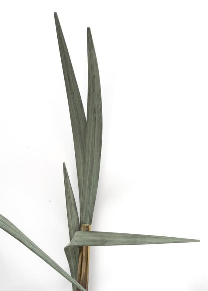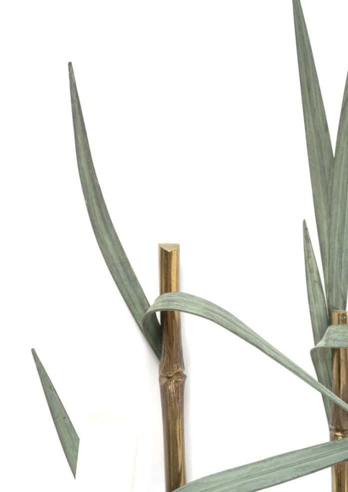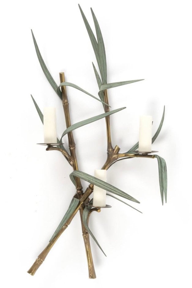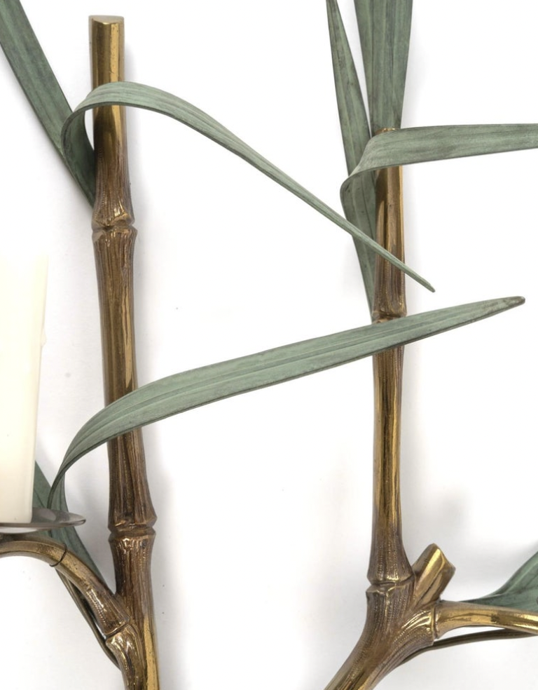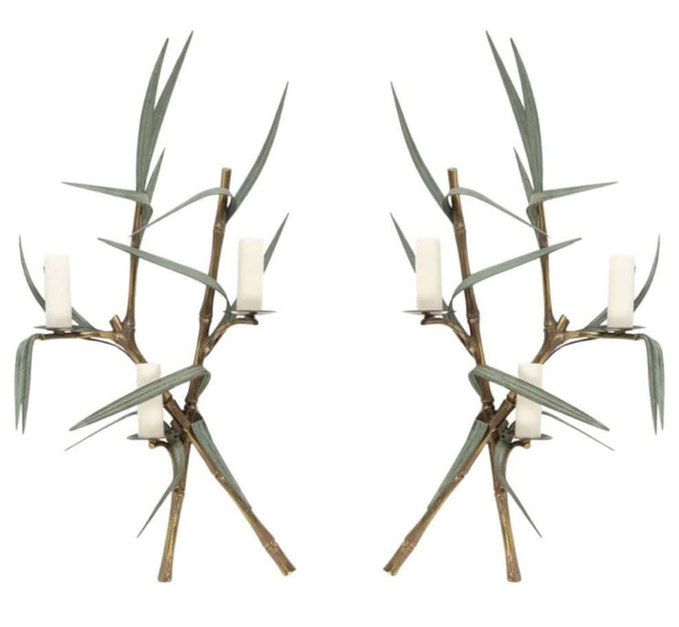 Composées de deux branches entrelacées en bronze doré imitant le bambou, décorées de feuillage vert (modèle rare en vert) sur lesquelles reposent trois bougies.