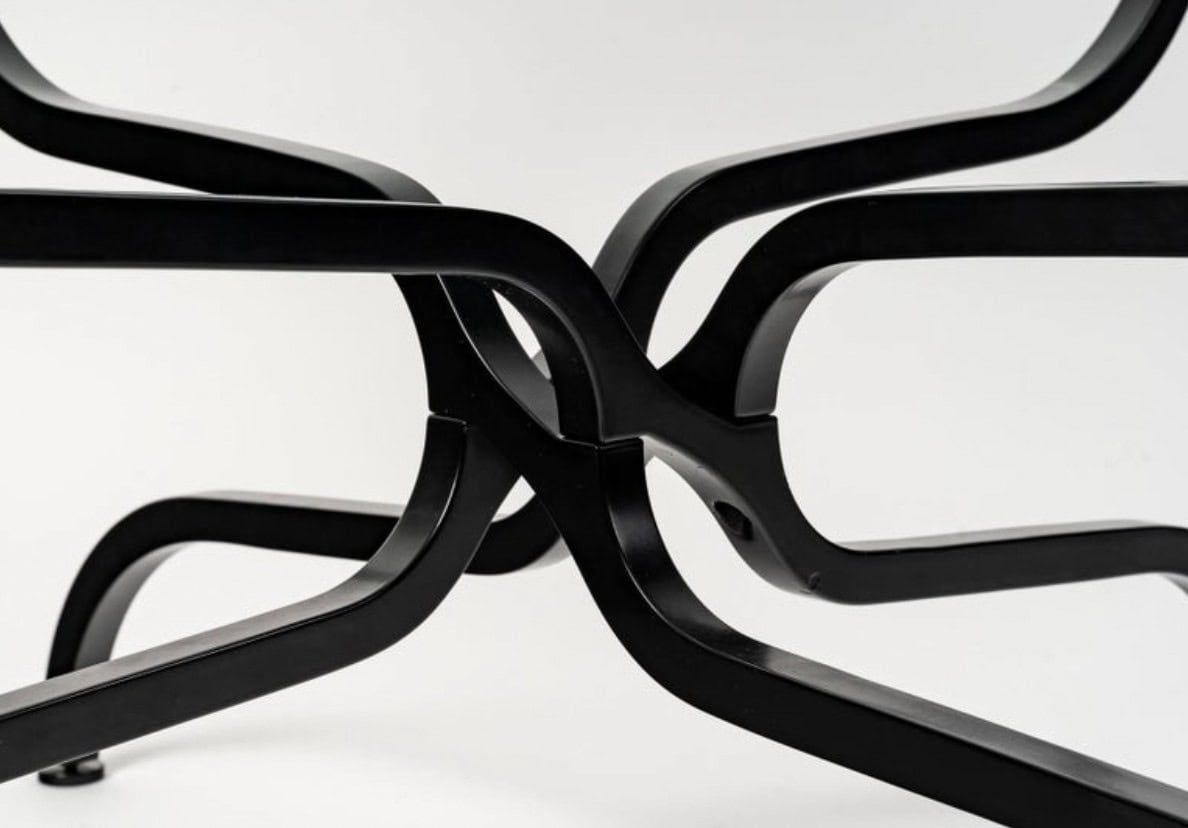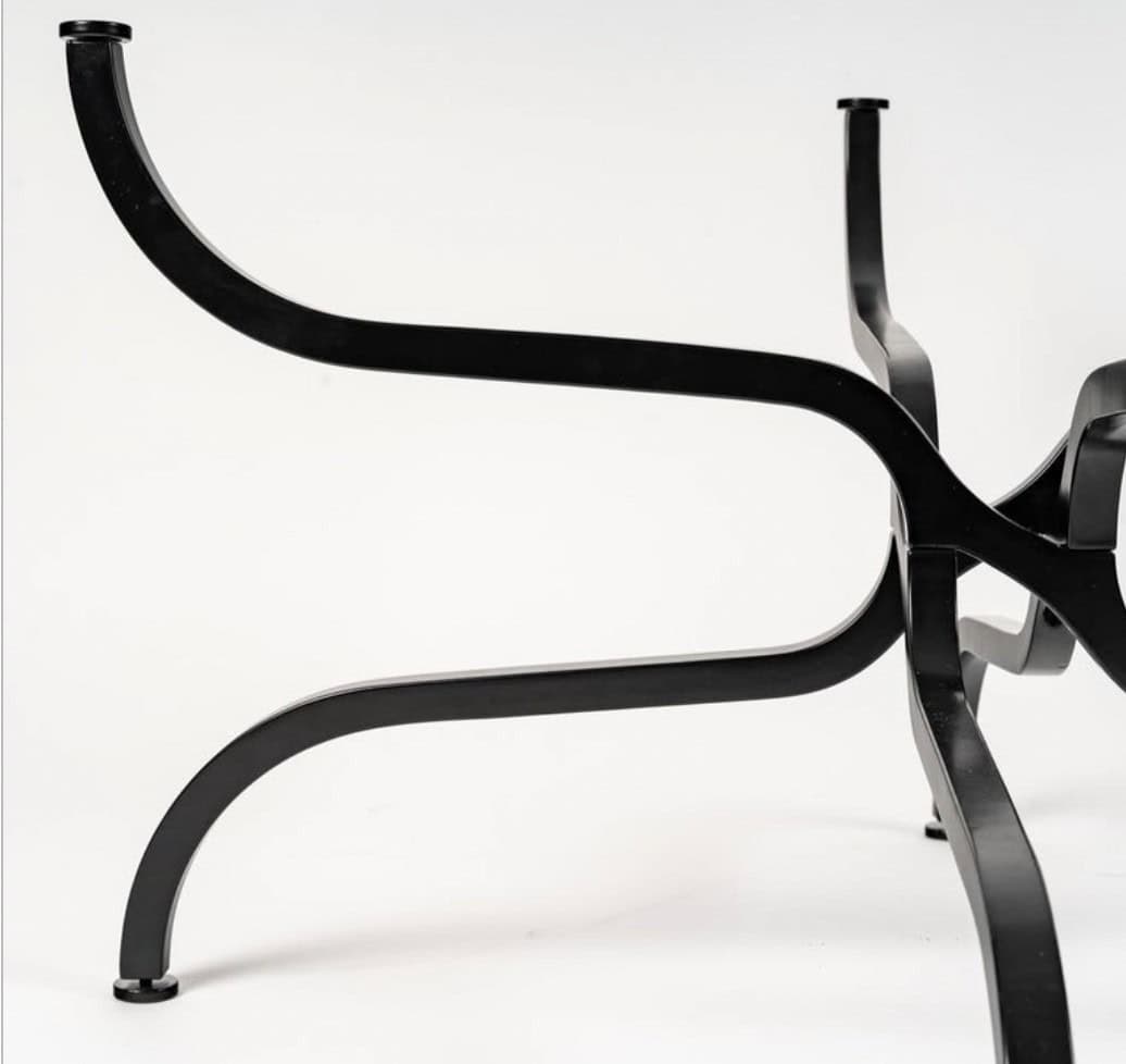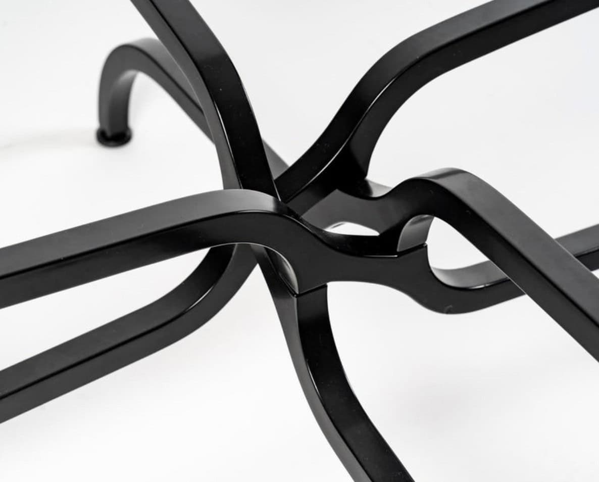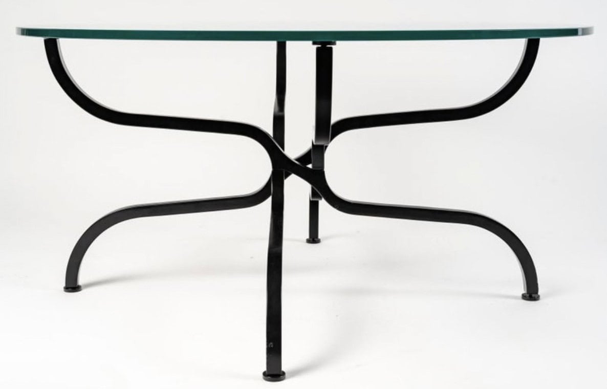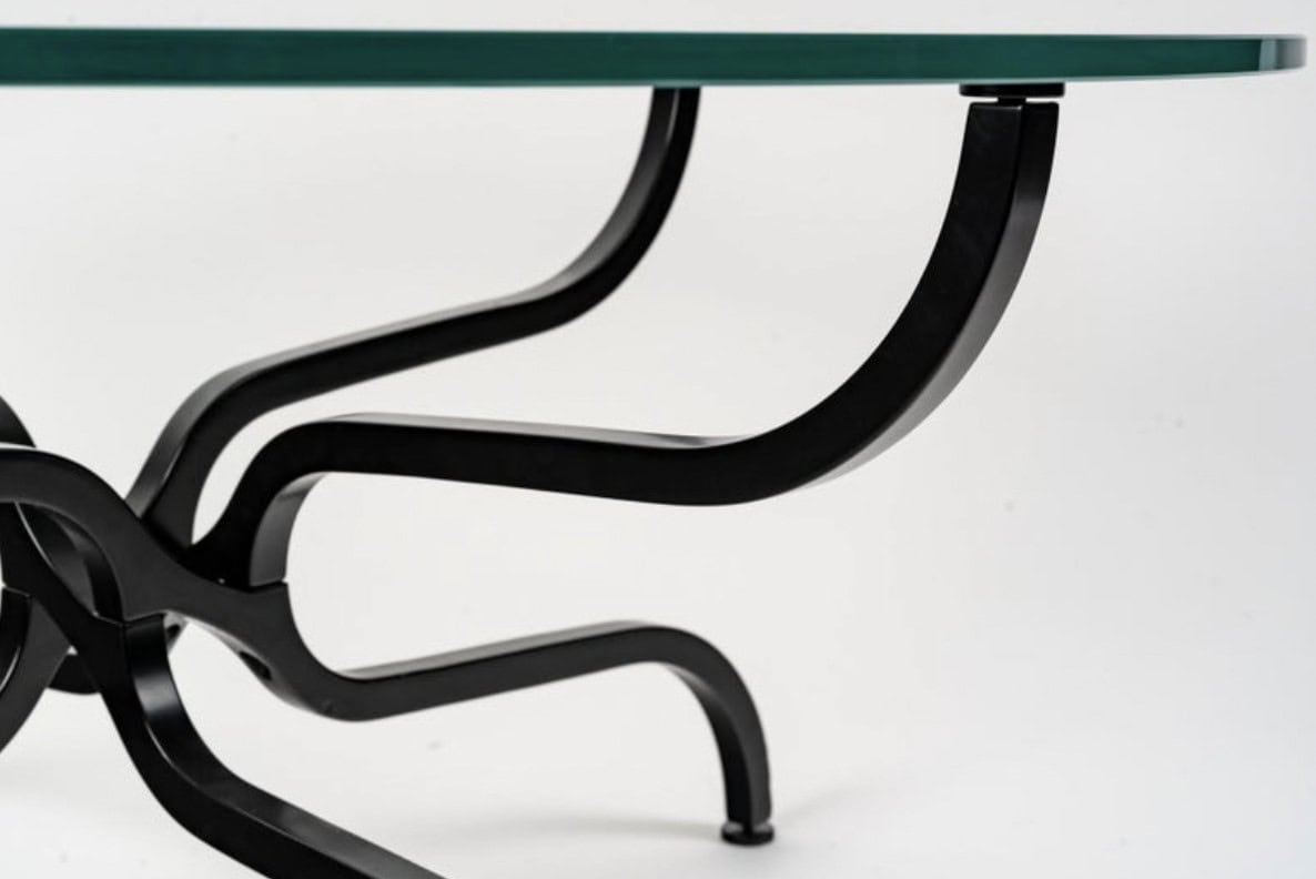 Composée d’une base en métal laqué noir satiné de section carrée formée de quatre pieds évasés reposant au sol, puis formant de très belles volutes entrelacées très ingénieuses sur le premier tiers sous le plateau en verre, pour s’évaser à nouveau et soutenir un plateau en verre rond épais biseauté sur le pourtour.