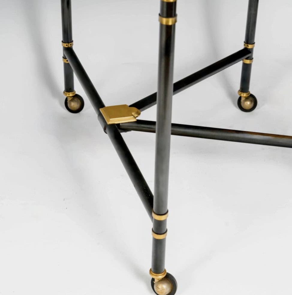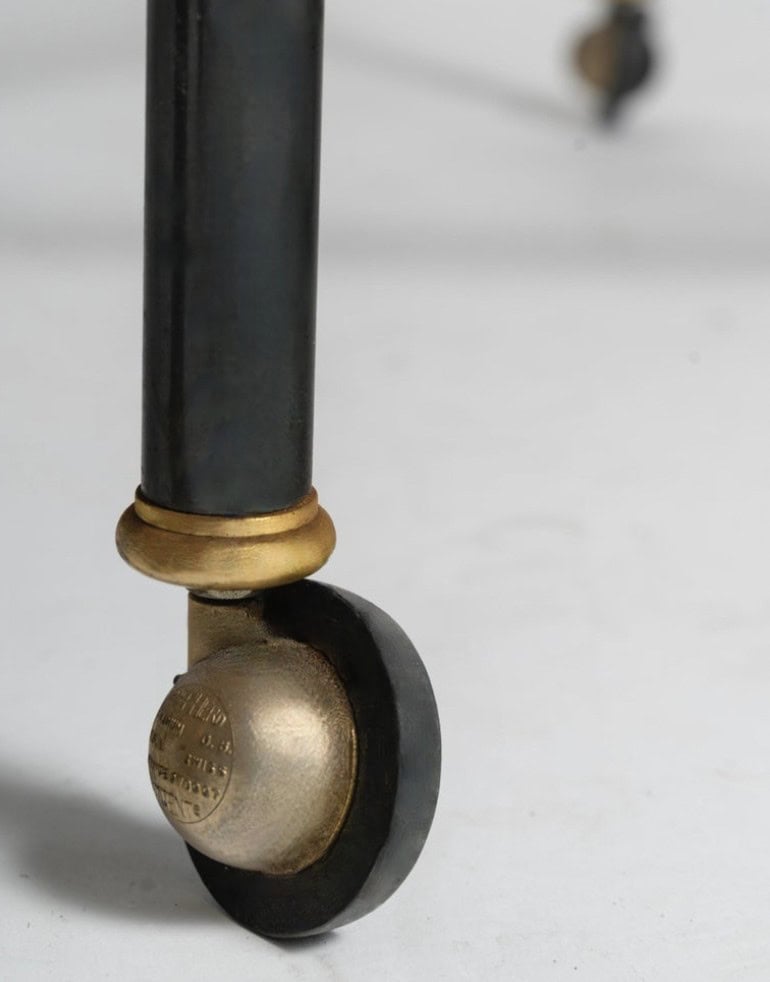 Pieds à double collier et manchettes en laiton. Estampillé sur les roulettes en laiton : « Shepherd Belgium G B U.S.A Swiss France 970997 patents ». Cale en bronze doré.