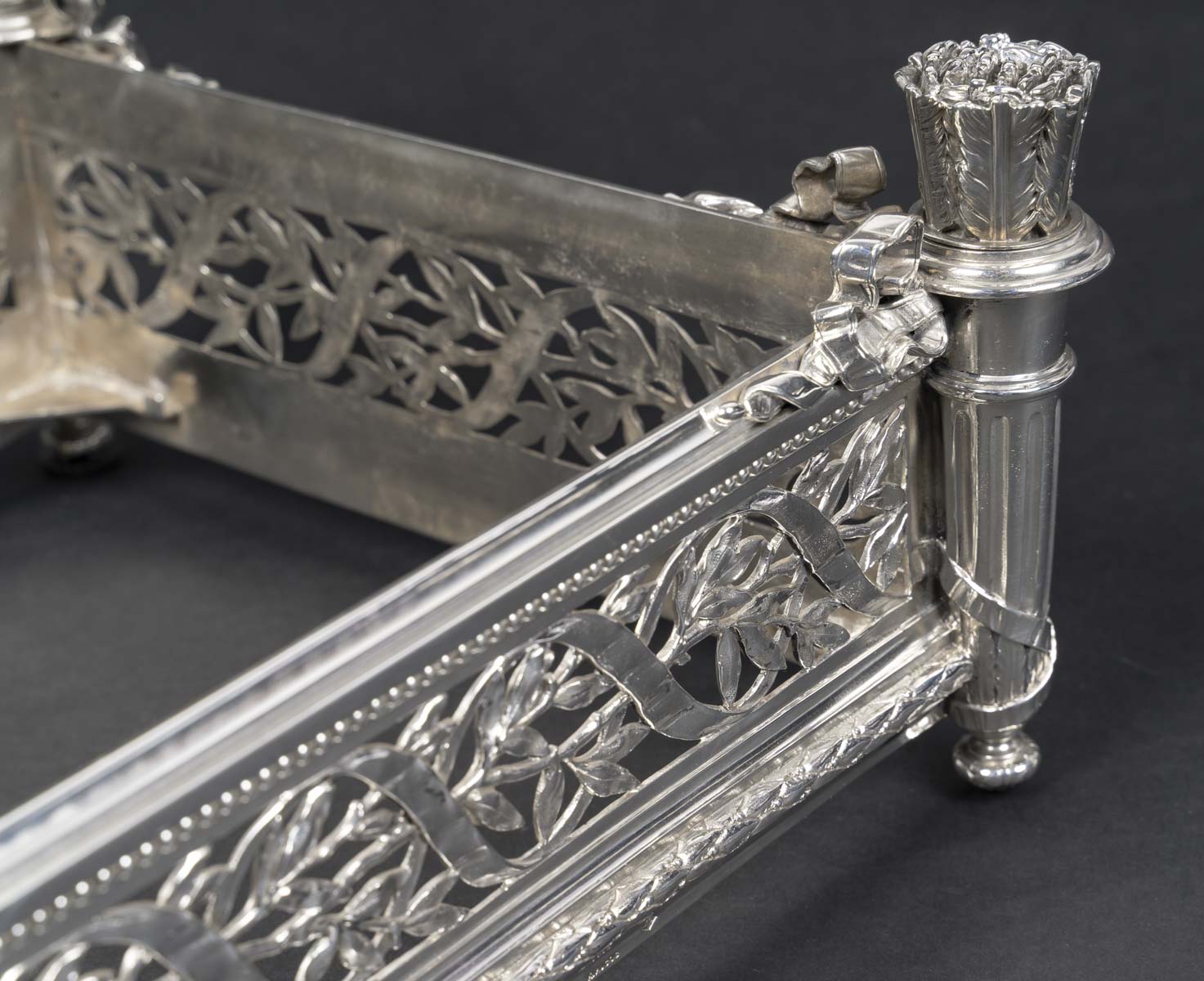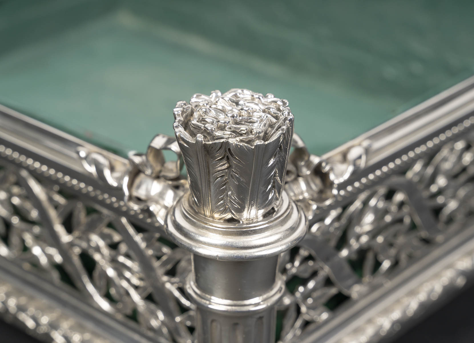 Jardinière rectangulaire en argent massif de forme rectangulaire reposant sur quatre pieds d’angle. Montants d’angle figurant des carquois stylisés, à décor de feuilles lancéolées, reposant sur des bases fuselées et terminés par de petites bobèches feuillagées.