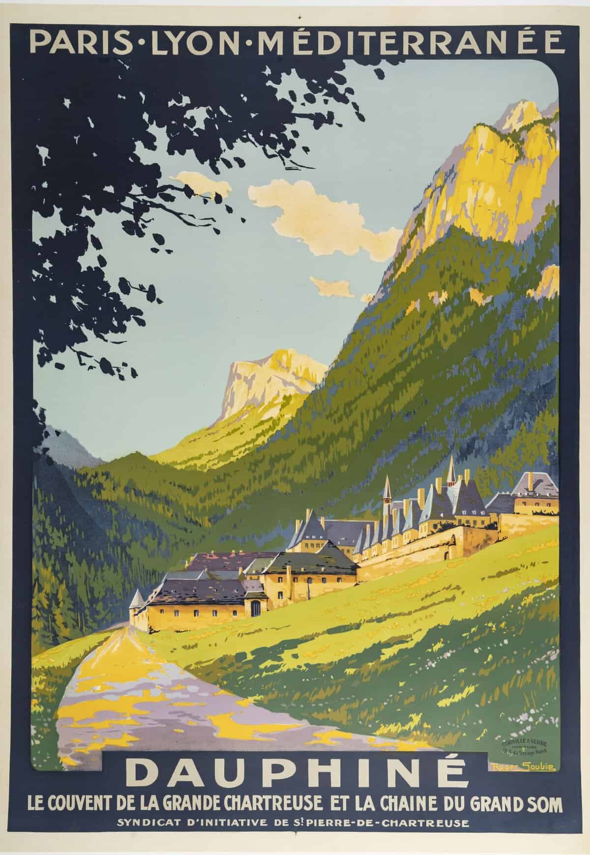Éditée pour la compagnie ferroviaire Paris-Lyon-Méditerranée (PLM), cette œuvre iconique met en scène le Couvent de la Grande Chartreuse, majestueusement installé au cœur du massif du Dauphiné, dans un paysage de montagne baigné de lumière. En arrière-plan, la chaîne du Grand Som se dresse dans toute sa splendeur, offrant un panorama spectaculaire.