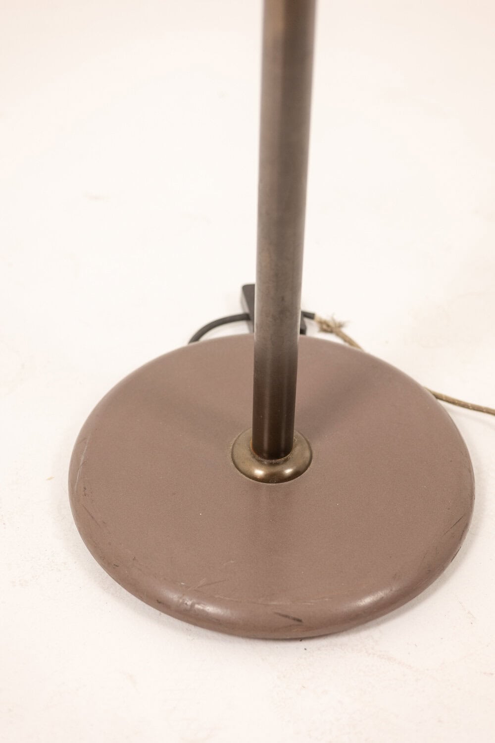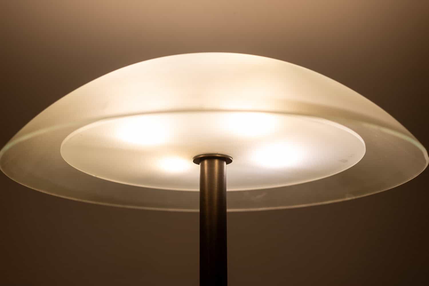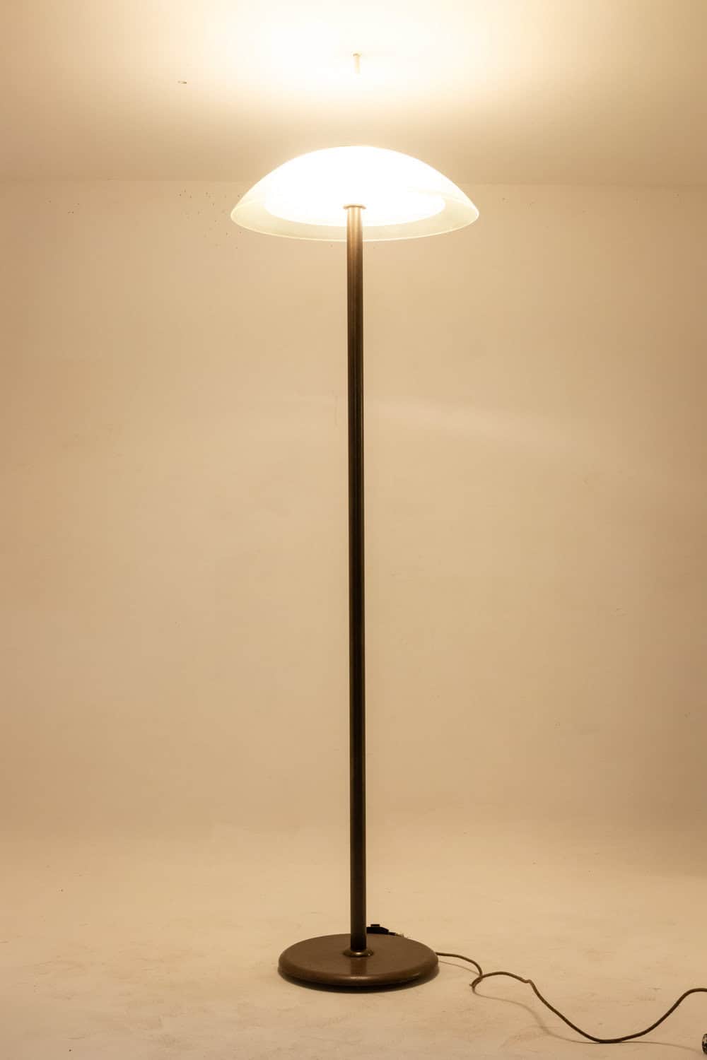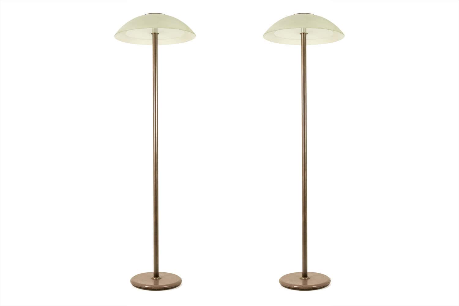 Paire de lampadaires de style Art Déco, en métal laqué couleur bronze et verre dépoli.