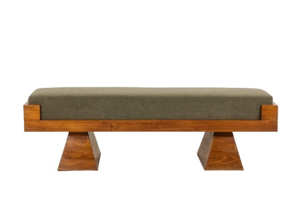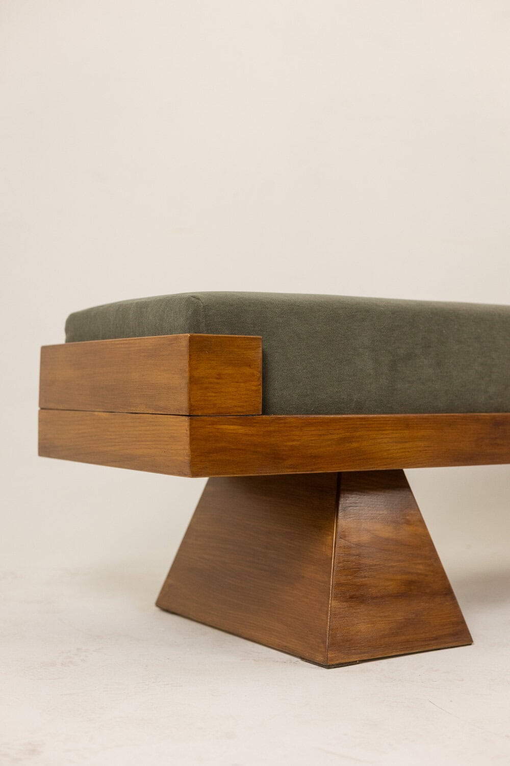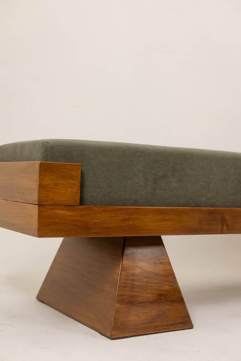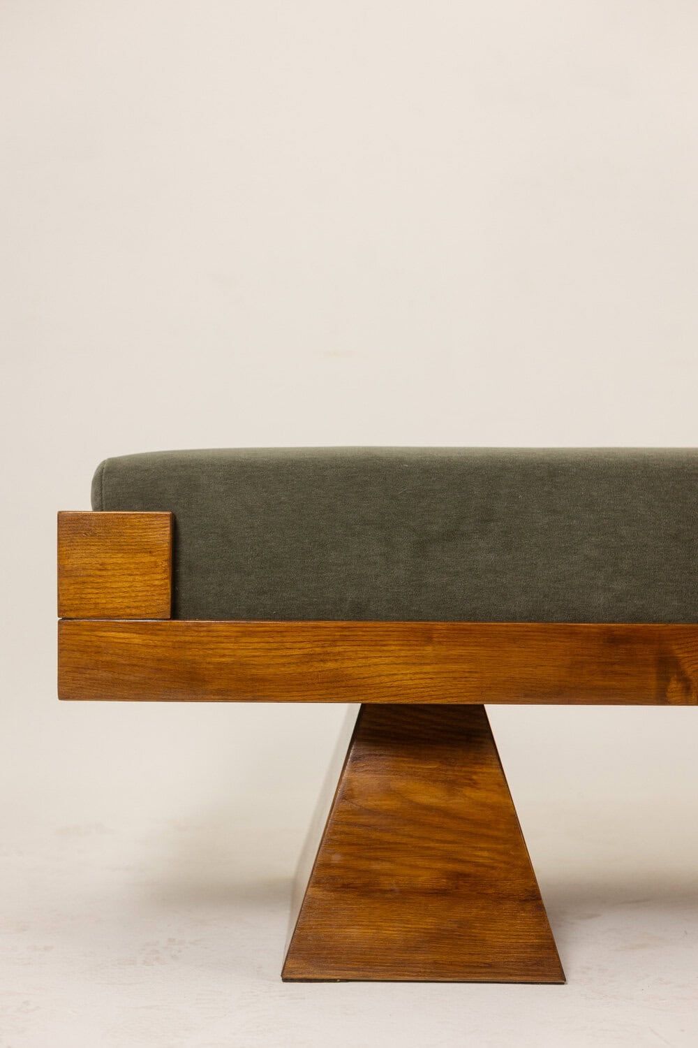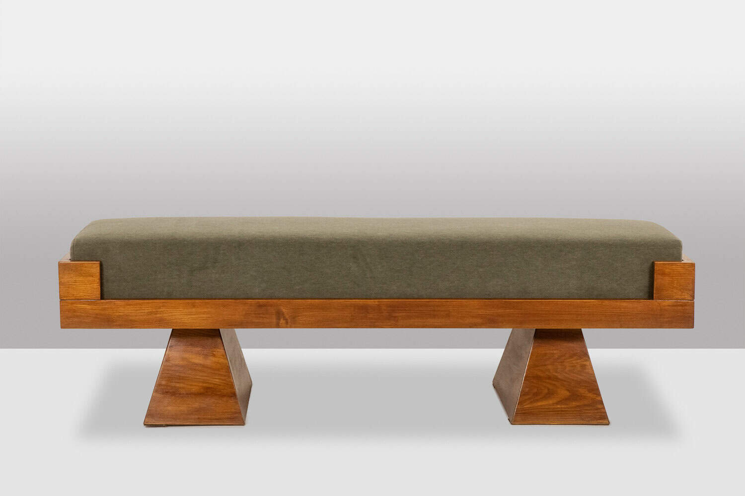 Banquette avec piètement en frêne et assise tapissée de velours de mohair vert.