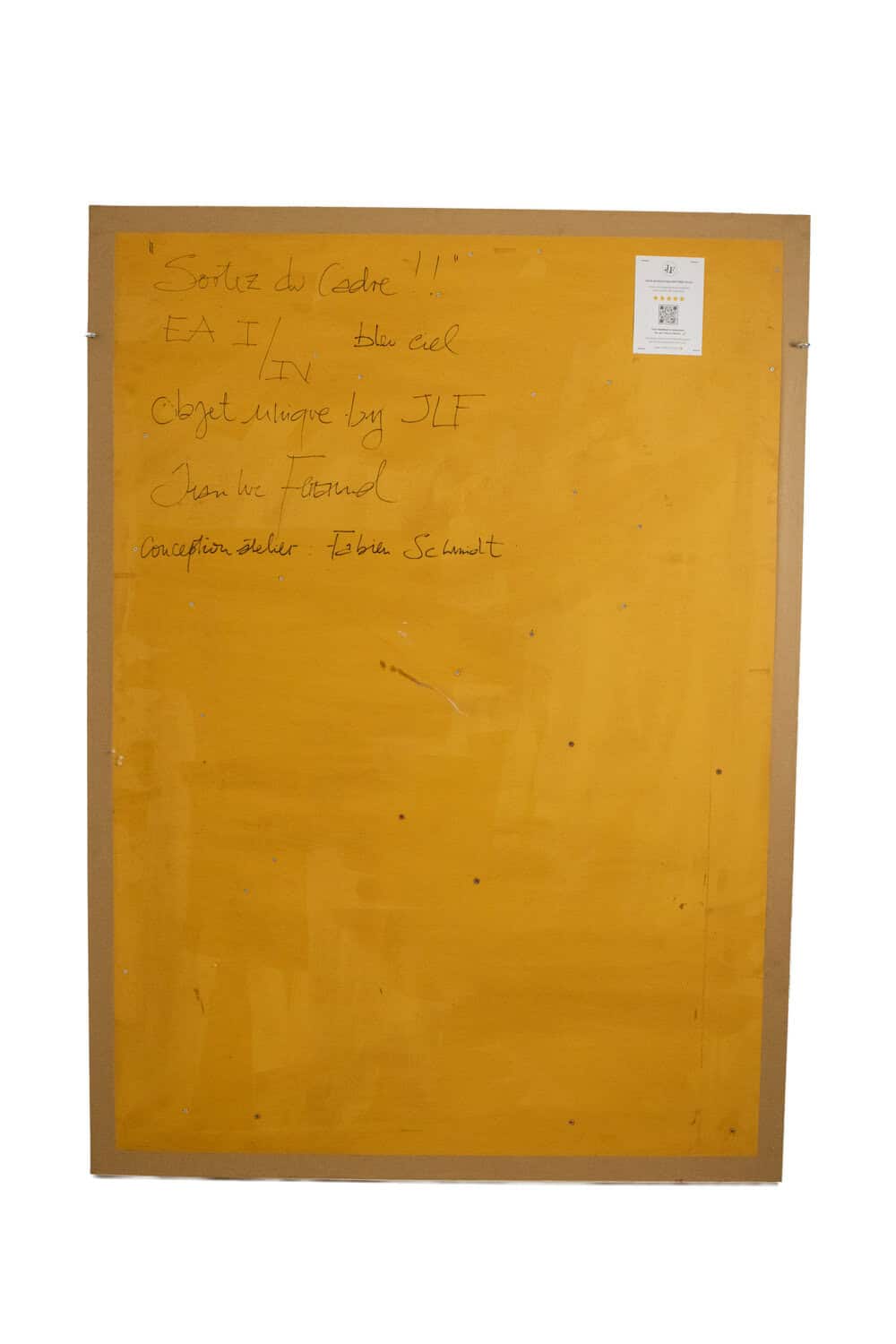 « Sortez du cadre », bas-relief en bois laqué bleu sur fond blanc, présenté dans un cadre à caisson en chêne blond naturel. Titré et signé « objet unique by JLF » au dos.