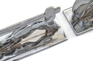 Enmétal argenté, chaque pièce portant lasignature « Benjamin Rabier »sur la terrasse.Dimensions :5,5 × 9,5 cm.Livrés dans leurboîte cartonnée d’origine