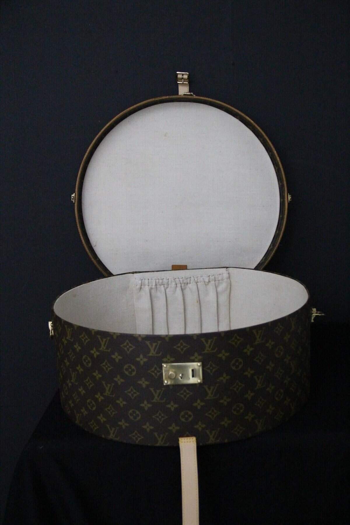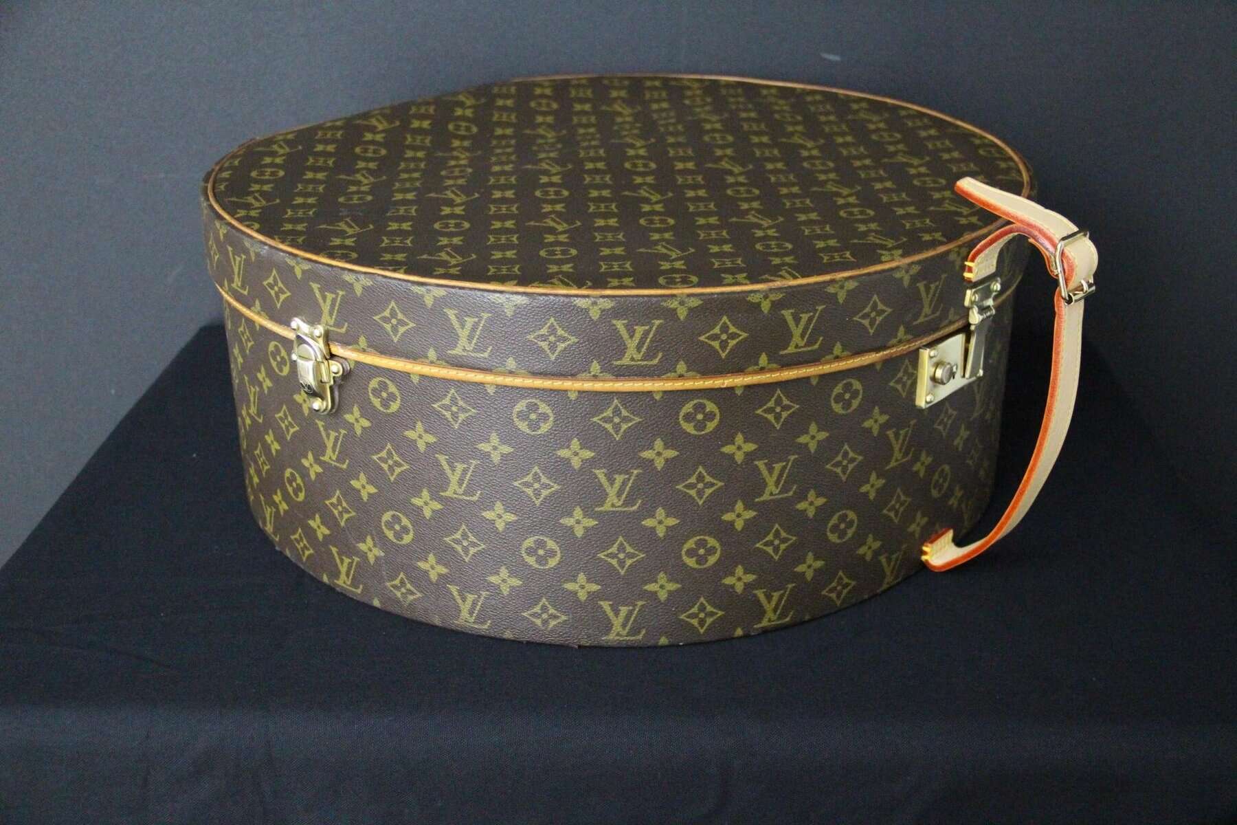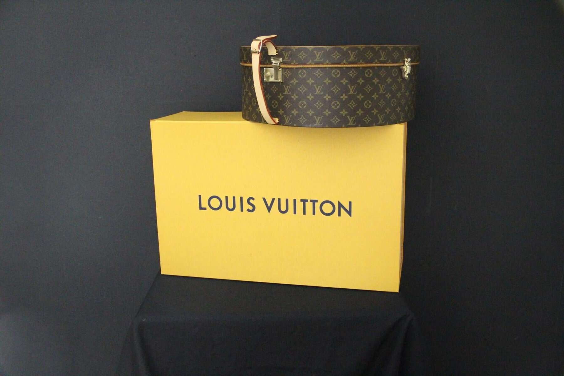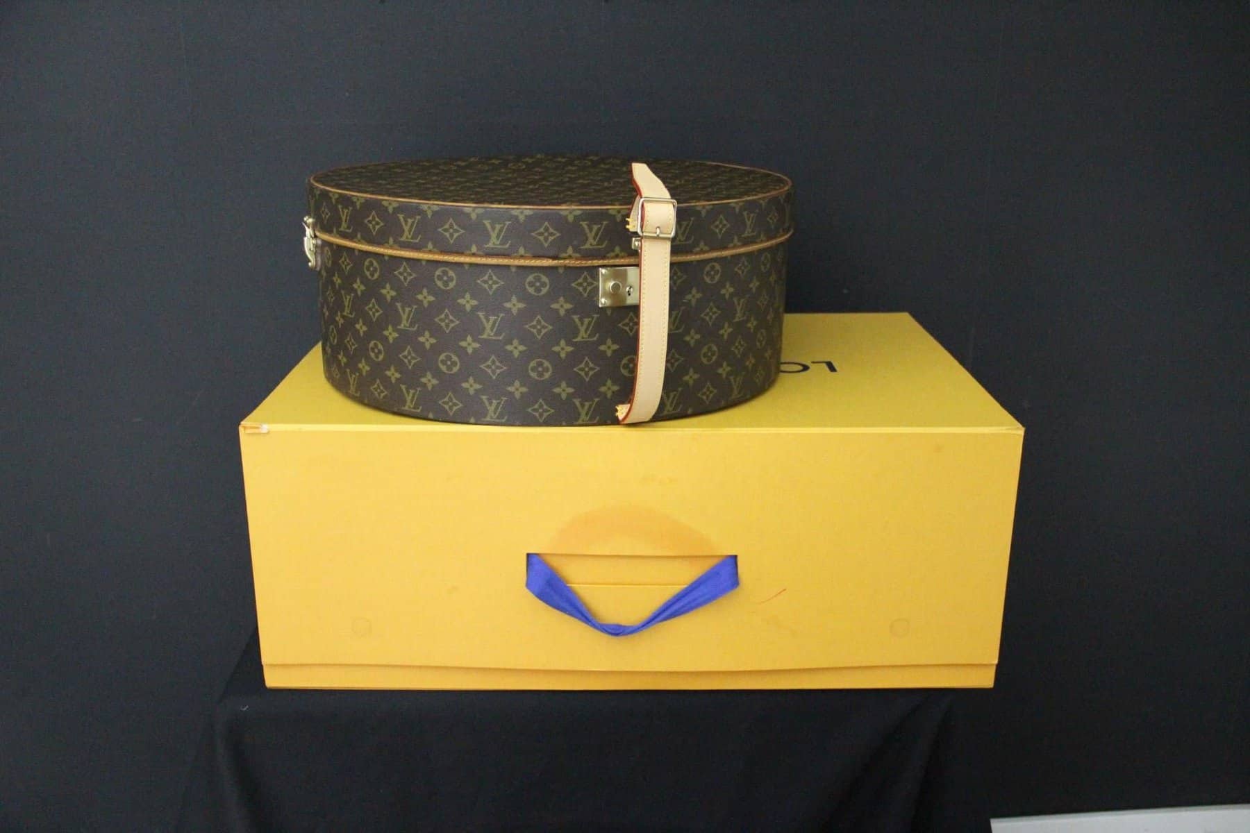Cette magnifique boîte à chapeaux Louis Vuitton est composée d’une structure en bois recouverte de toile Monogram et renforcée par du cuir naturel. Elle est équipée d’une sangle en cuir réglable. Elle présente un fermoir en laiton et deux fermoirs en laiton estampillés Louis Vuitton sur les côtés.. Intérieur d’origine beige avec poche. Intérieur très propre, sans tache ni odeur. Étiquette Louis Vuitton en cuir à l’intérieur. Pieds de protection en laiton doré. Elle est livrée avec sa boîte Louis Vuitton d’origine. Vous pouvez voyager avec cette magnifique pièce ou simplement l’utiliser comme élément de décoration haut de gamme, par exemple comme table de chevet, table d’appoint ou boîte à bijoux. Cette taille n’est plus disponible dans les boutiques Louis Vuitton, c’est une véritable pièce de collection. H 20 cm x Dm 50 cm. Veuillez noter que sa sangle en cuir a été refaite récemment chez Louis Vuitton, ainsi que les coutures à l’arrière. Son état est correct, mais veuillez noter que, comme le montrent les photos, sa surface supérieure est légèrement ondulée.