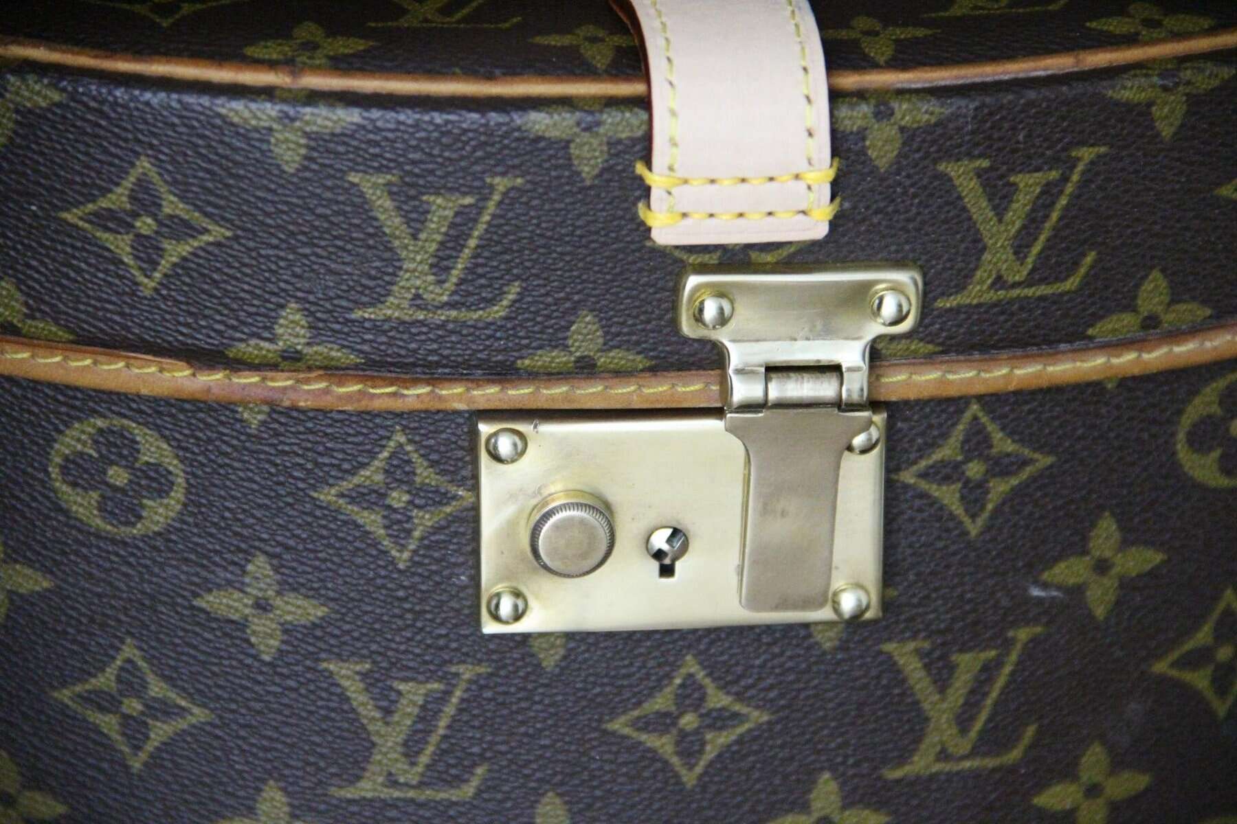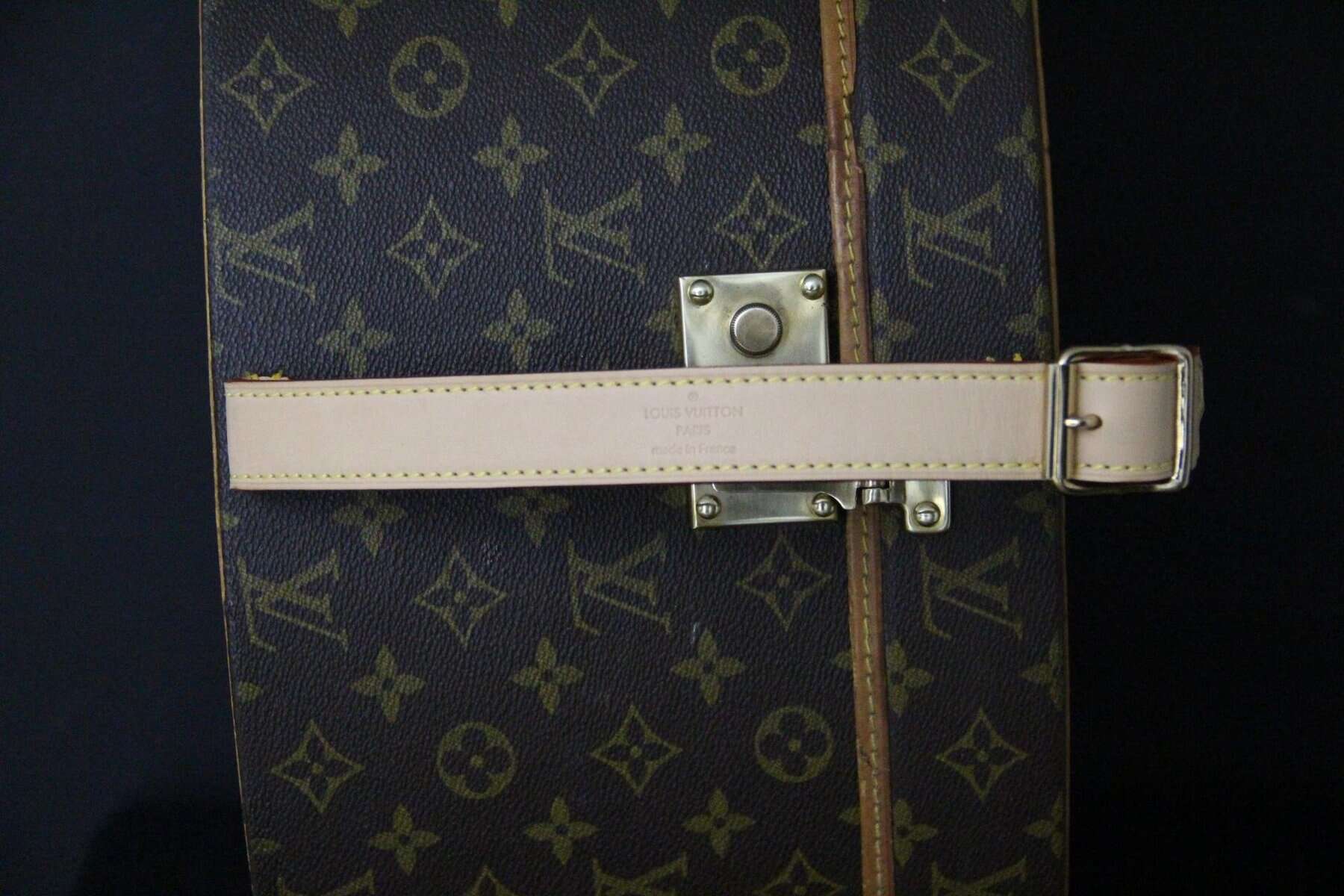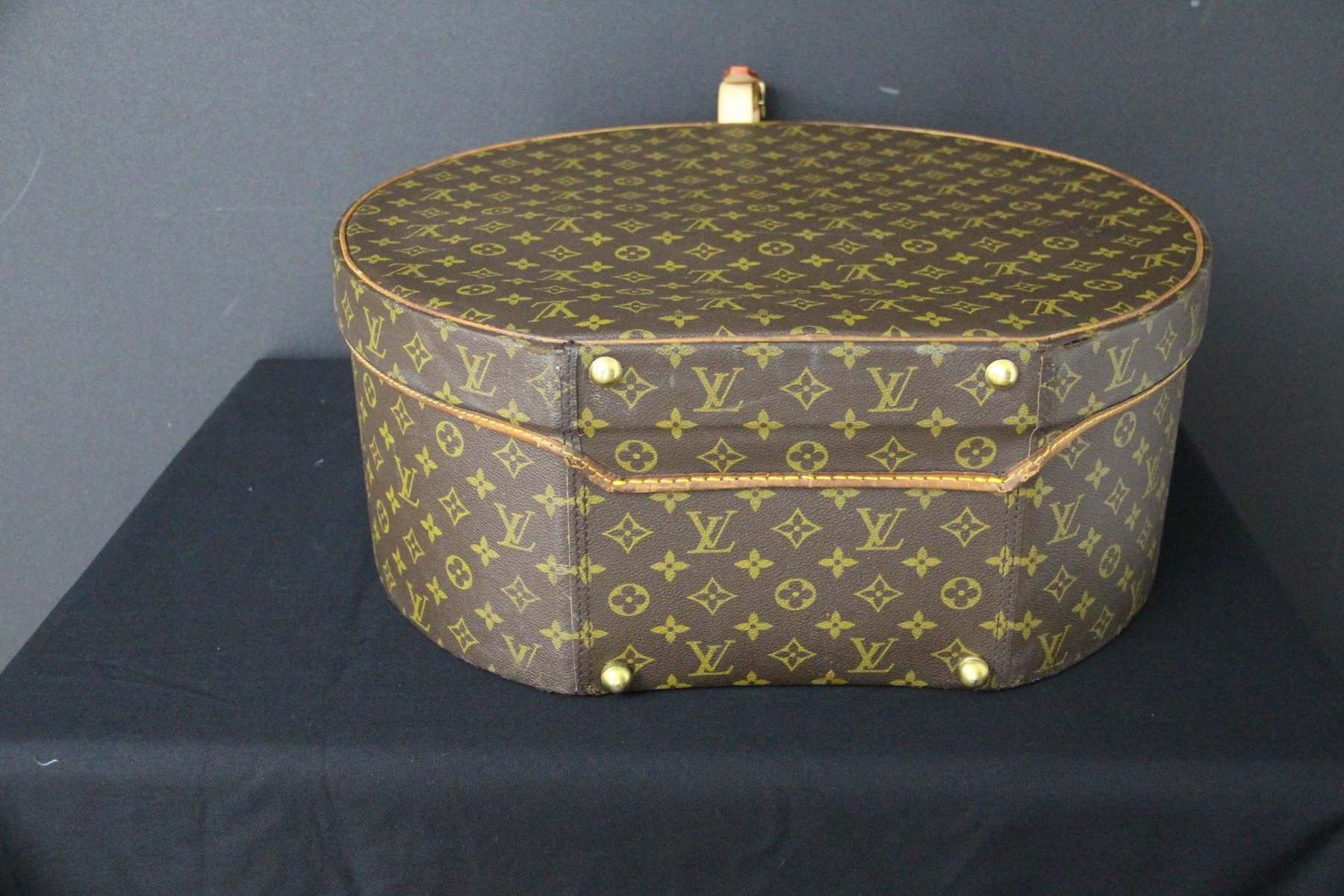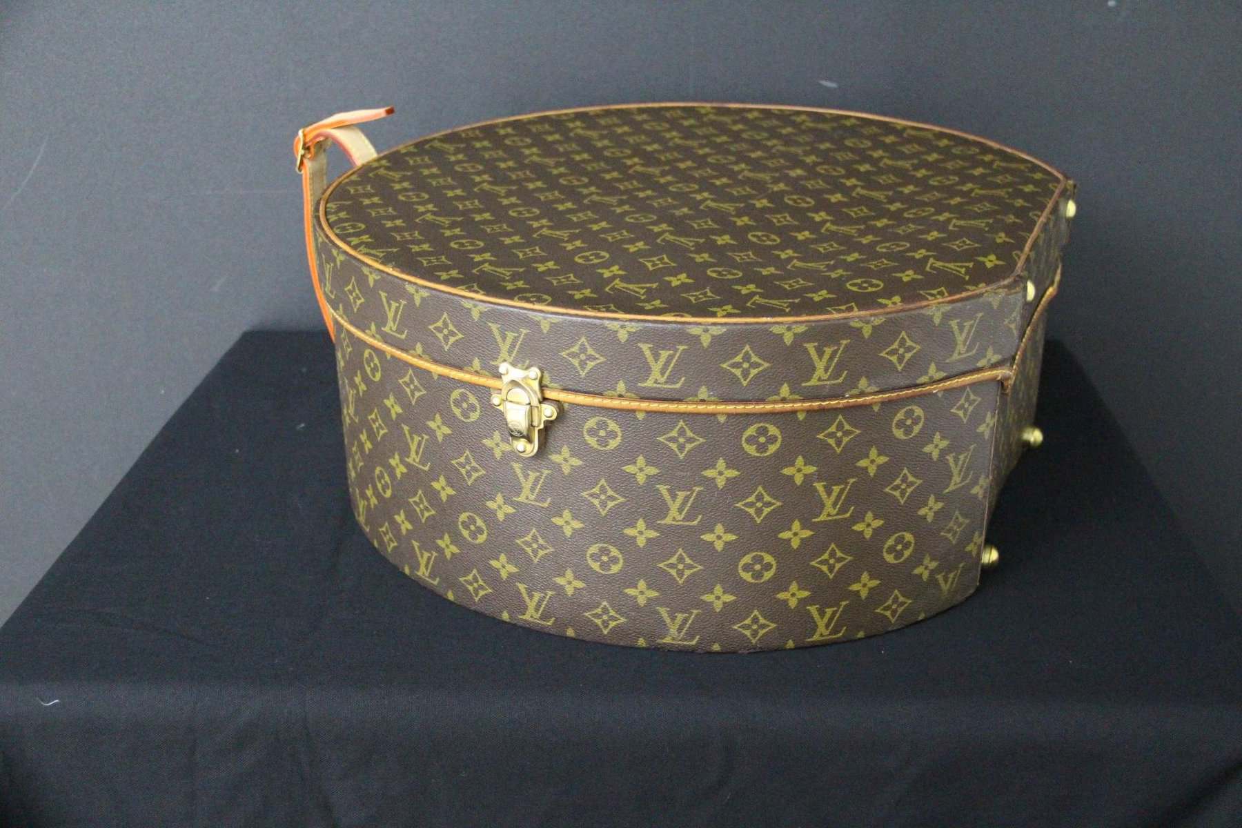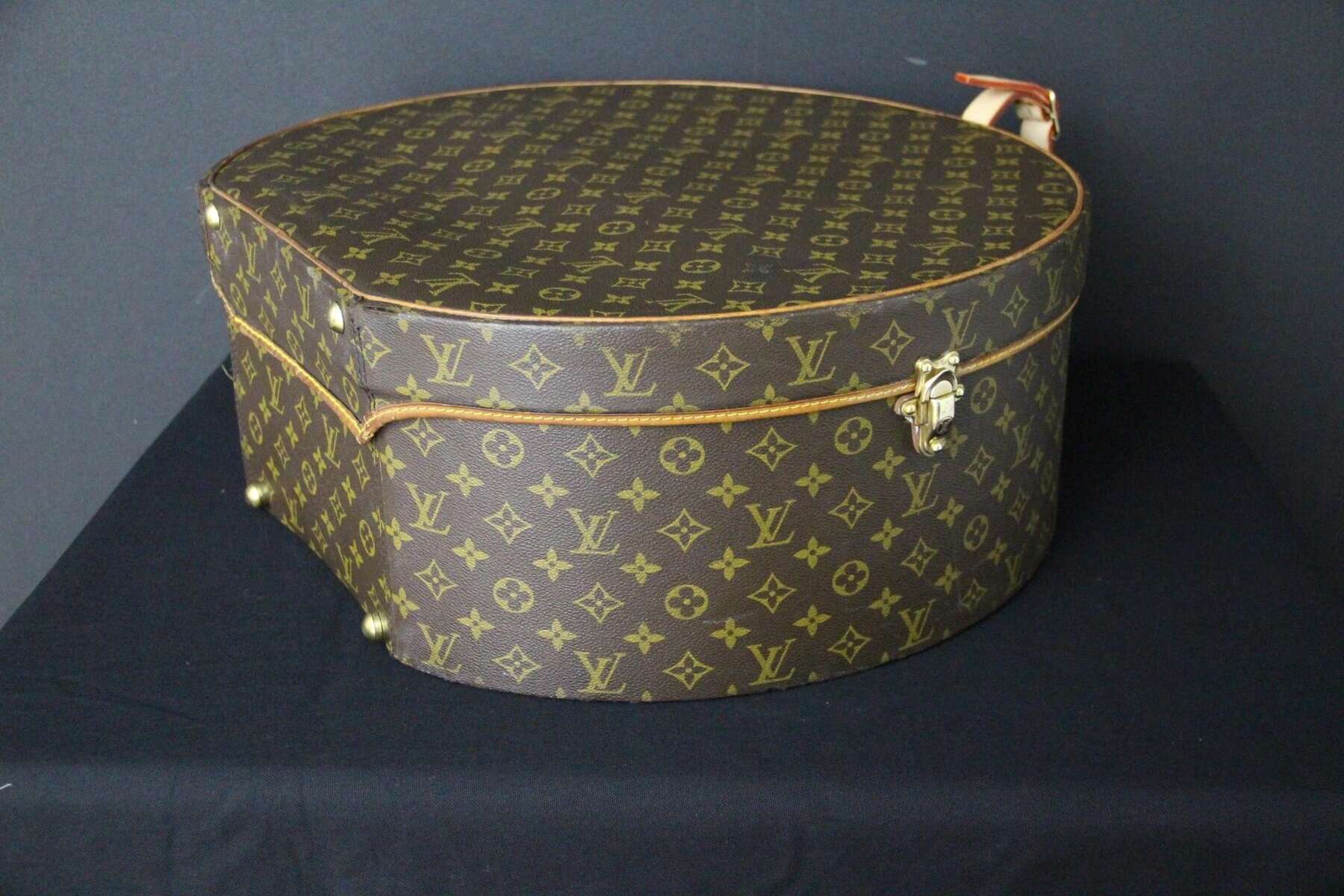 Cette magnifique boîte à chapeaux Louis Vuitton est composée d’une structure en bois recouverte de toile Monogram et renforcée par du cuir naturel. Elle est équipée d’une sangle en cuir réglable. Elle présente un fermoir en laiton et deux fermoirs en laiton estampillés Louis Vuitton sur les côtés.. Intérieur d’origine beige avec poche. Intérieur très propre, sans tache ni odeur. Étiquette Louis Vuitton en cuir à l’intérieur. Pieds de protection en laiton doré. Elle est livrée avec sa boîte Louis Vuitton d’origine. Vous pouvez voyager avec cette magnifique pièce ou simplement l’utiliser comme élément de décoration haut de gamme, par exemple comme table de chevet, table d’appoint ou boîte à bijoux. Cette taille n’est plus disponible dans les boutiques Louis Vuitton, c’est une véritable pièce de collection. H 20 cm x Dm 50 cm. Veuillez noter que sa sangle en cuir a été refaite récemment chez Louis Vuitton, ainsi que les coutures à l’arrière. Son état est correct, mais veuillez noter que, comme le montrent les photos, sa surface supérieure est légèrement ondulée.