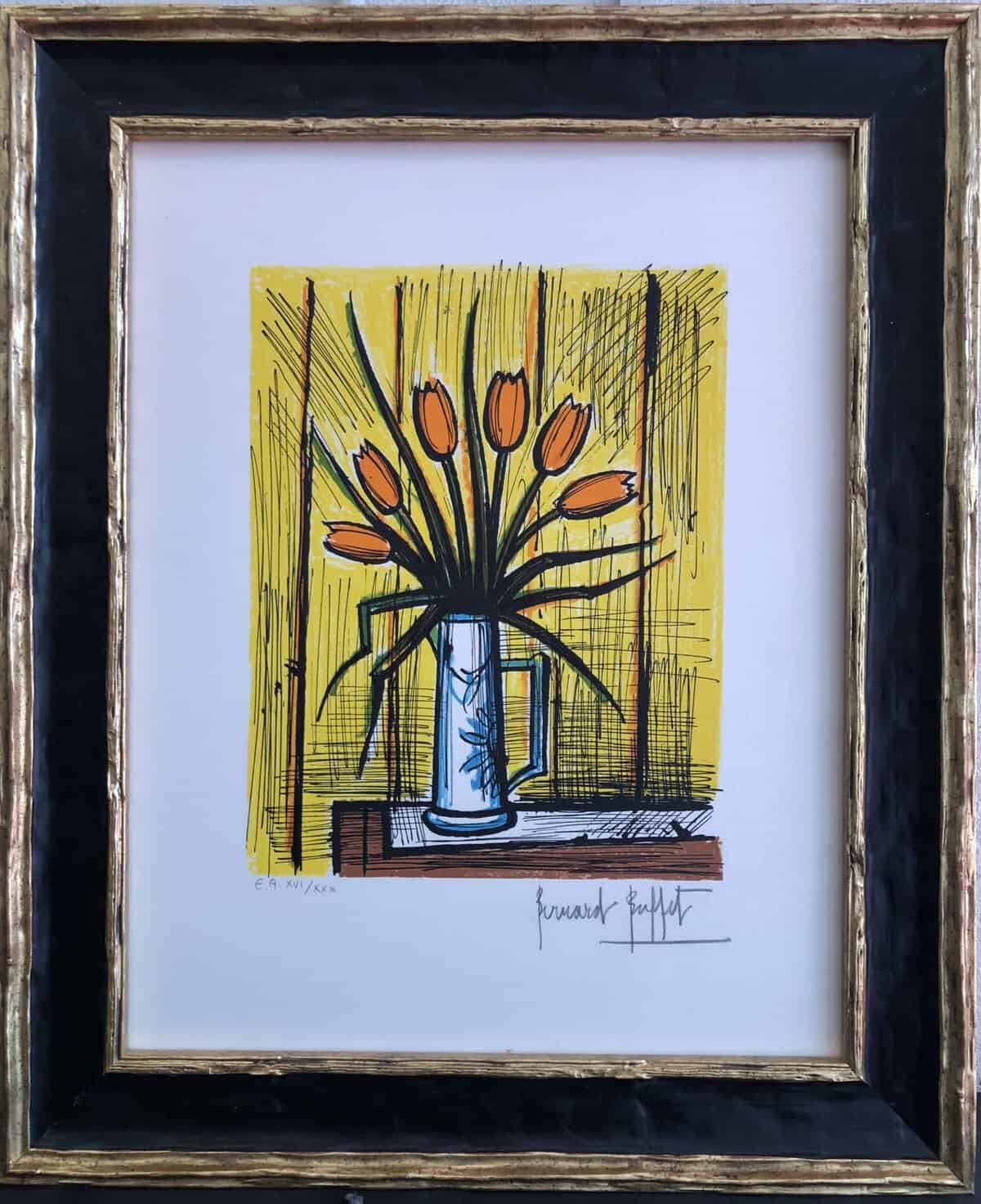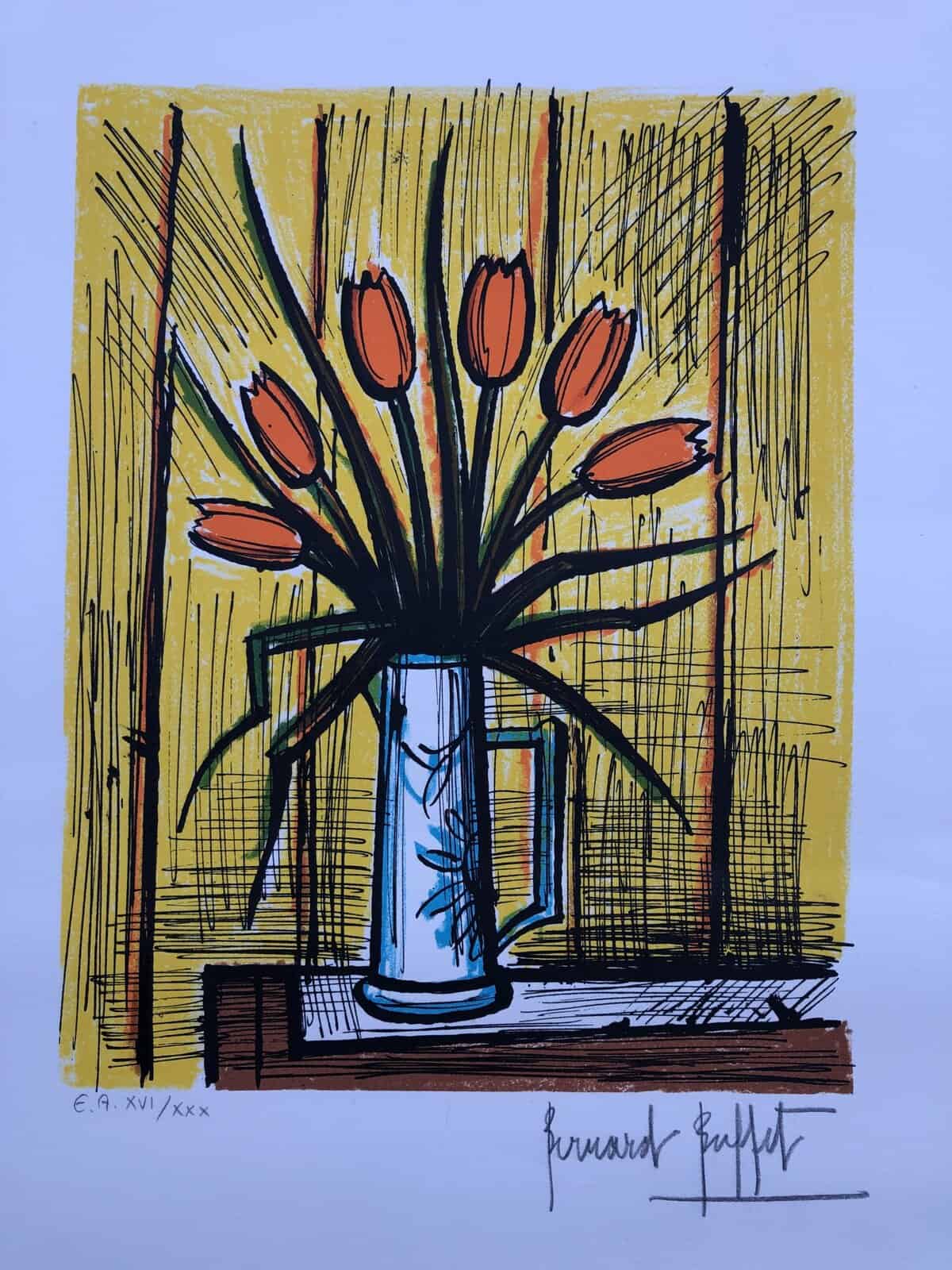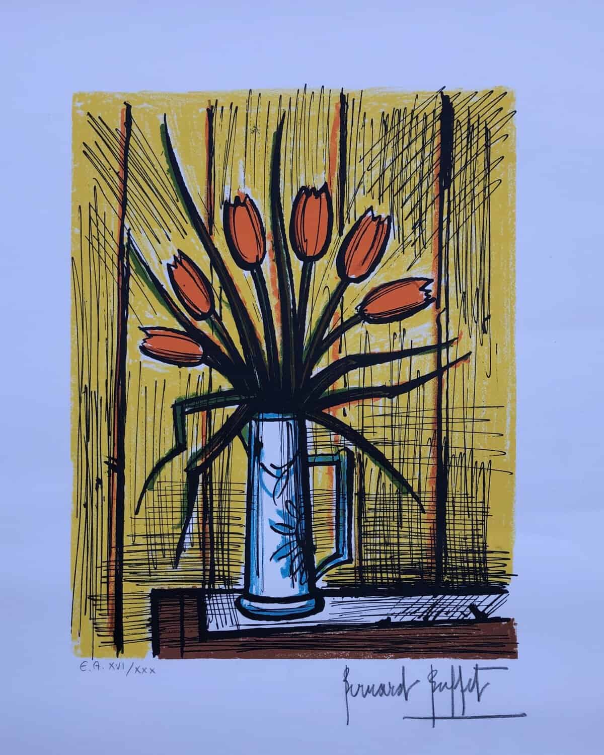 BUFFET Bernard Bouquet tulipes oranges Lithographie Couleurs Signée certificat d’authenticité