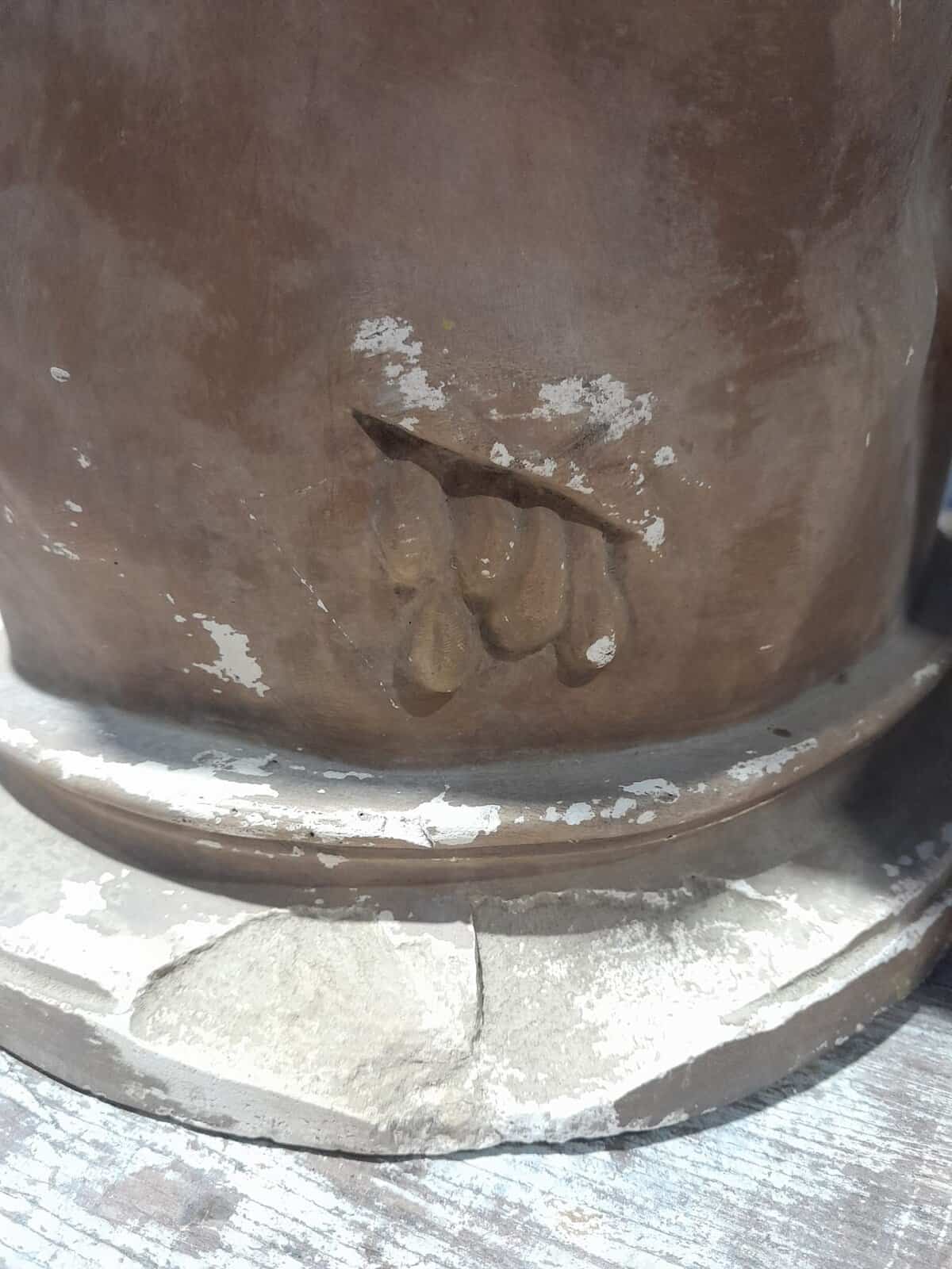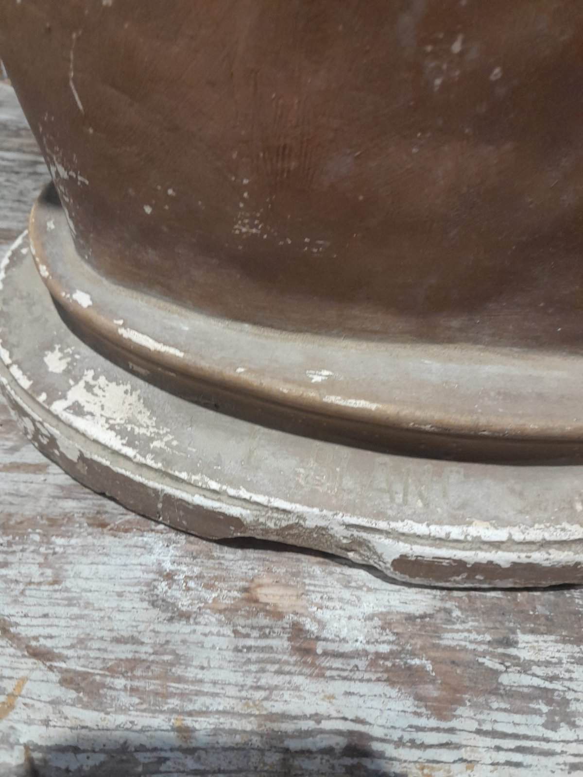 2 éclats sur le côté et l’avant de la base, quelques manques dans la peinture beige, le tout visible sur les photos.