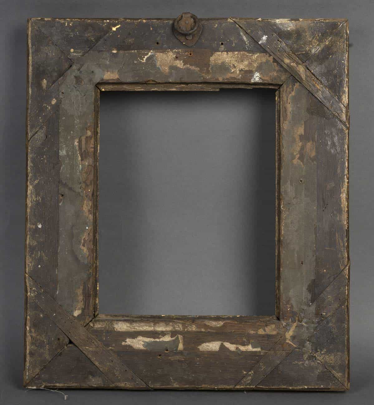Cadre en chêne sculpté, doré à décor de frises de lambrequins, culots, enroulements de feuilles et fleurs d’acanthe.