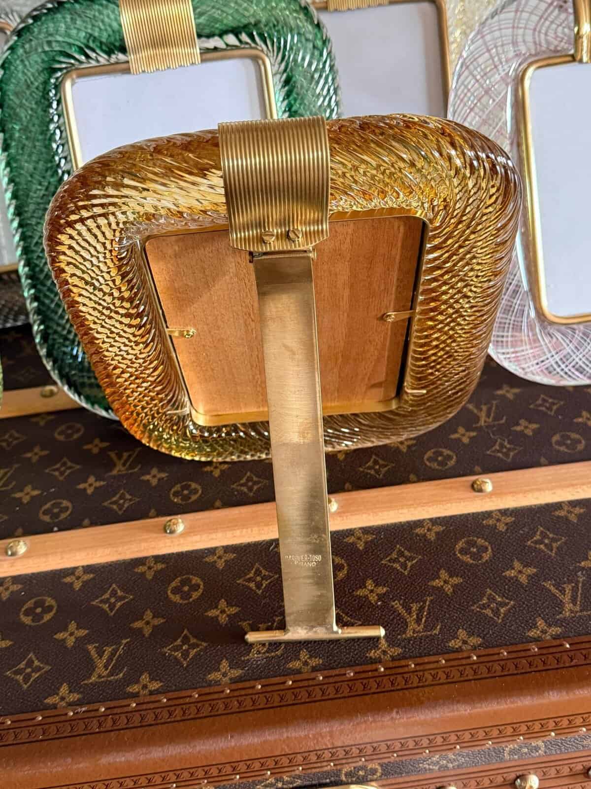 Ce magnifique cadre photo vertical est purement dans la tradition de la fabrication du verre vénitien. La technique utilisée pour obtenir ce riche effet de corde torsadée est appelée « torciglione » et requiert des artisans hautement qualifiés.