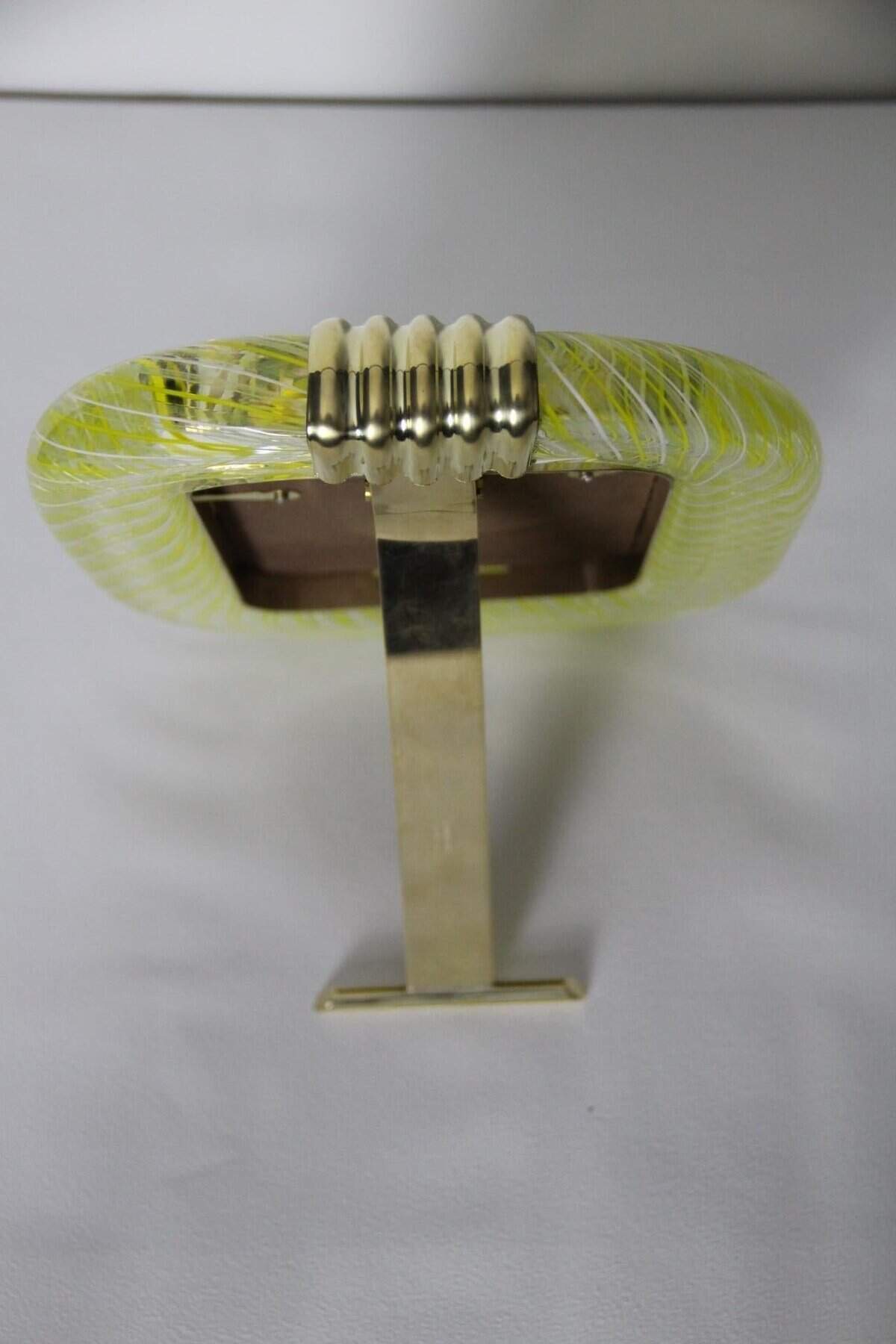 Ce magnifique cadre photo vertical est purement dans la tradition de la fabrication du verre vénitien tradition. La technique utilisée pour obtenir ce riche effet optique est appelée filigrana et nécessite des artisans hautement qualifiés. Ce cadre photo est composé de verre de Murano jaune-vert d’une couleur très vivante, recouvert de cristal. De fines lignes jaunes et blanches s’enroulent autour du cadre en verre de cristal comme des fils très fins.