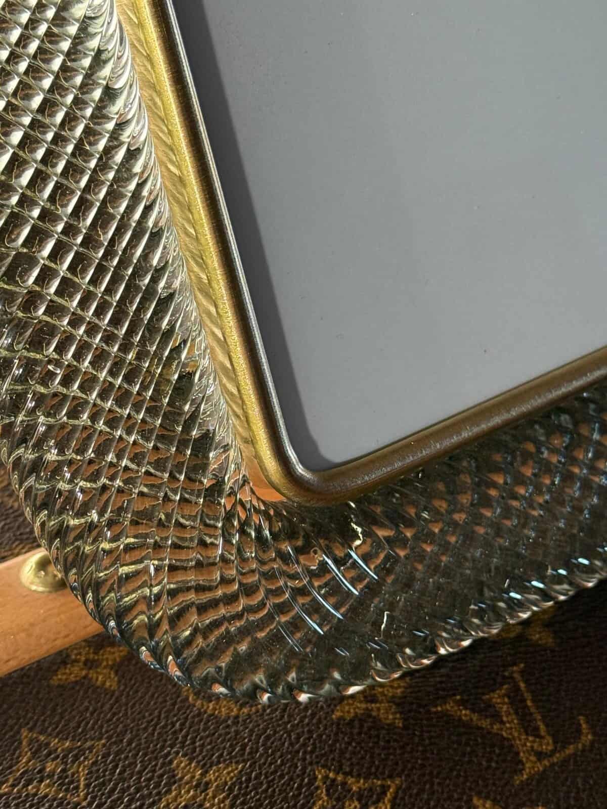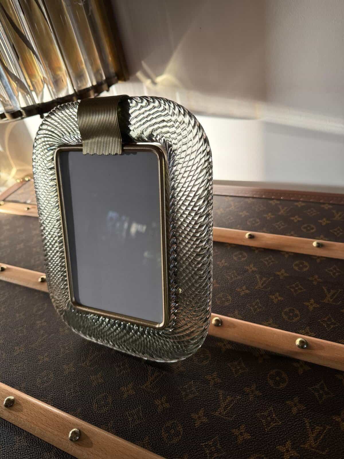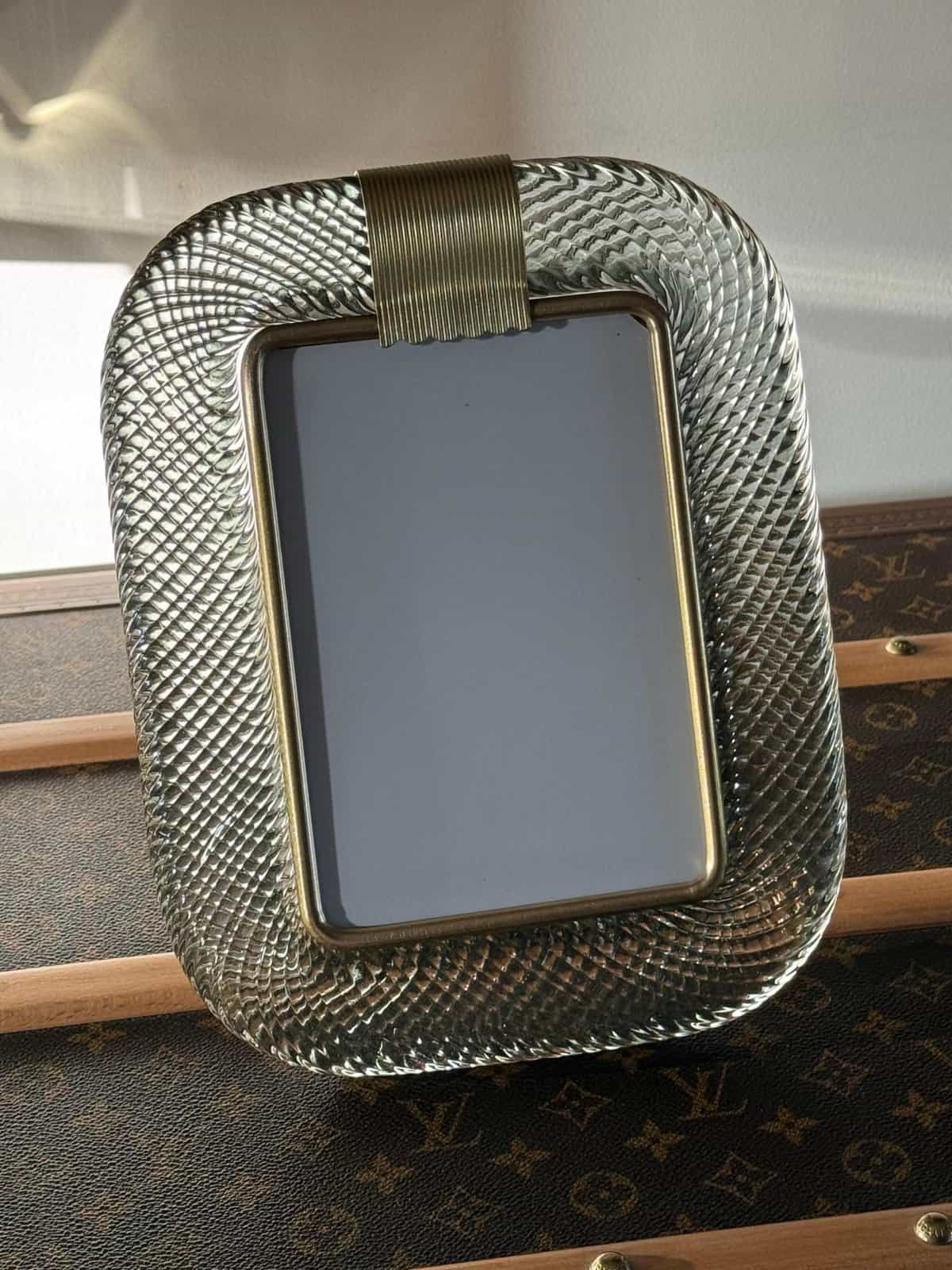 Ce cadre photo est composé de verre soufflé de Murano d’un gris très fumé, recouvert de cristal. Il peut être assorti à des intérieurs vintage, classiques, art déco, mid century ou contemporains et sera parfait pour orner vos bibliothèques, vos consoles, vos étagères ou vos coffres…
