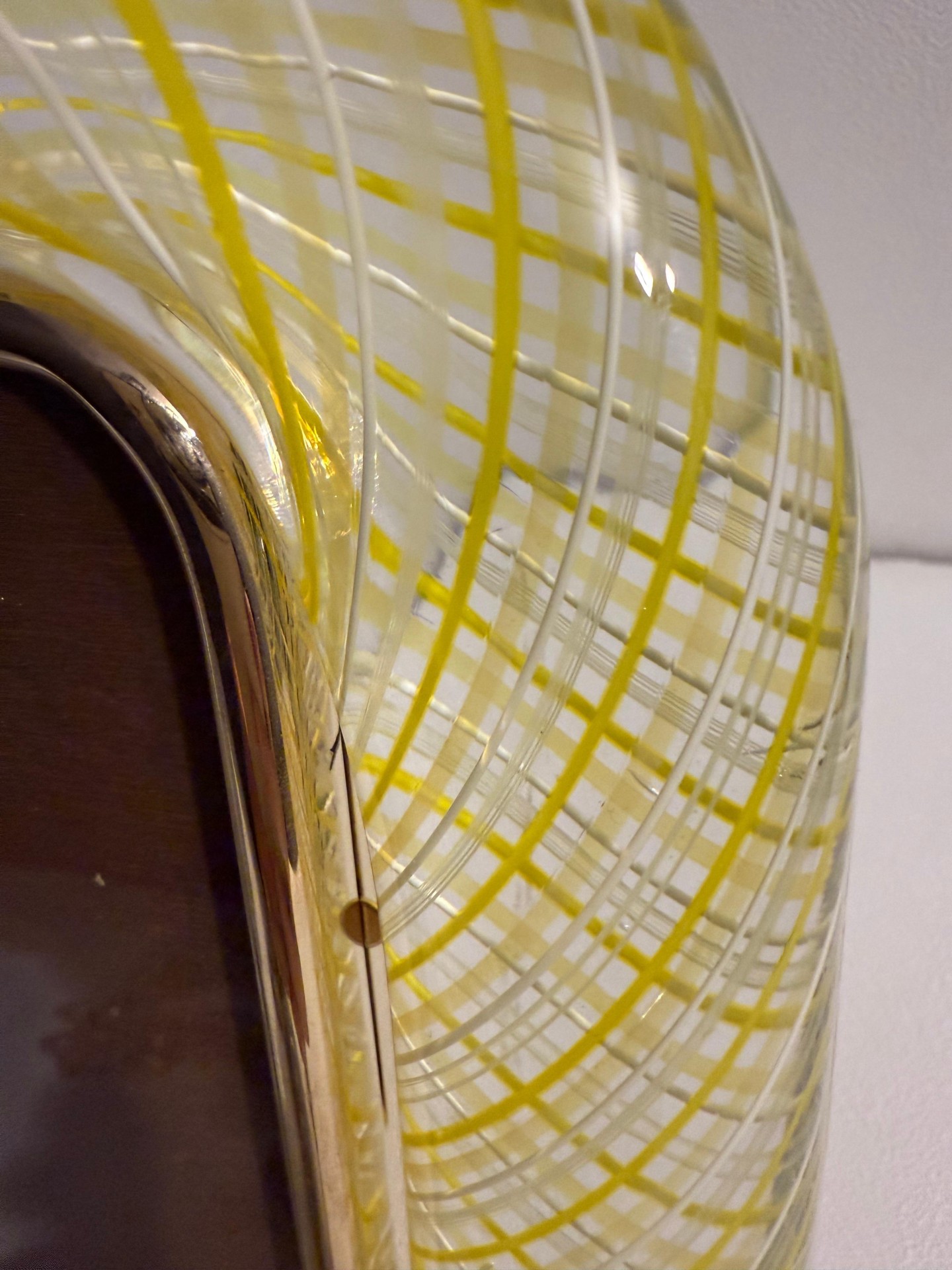EN STOCKCe beau cadre photo vertical est purement dans la tradition de fabrication du verre vénitien. La technique utilisée pour obtenir cet effet optique riche est appelée filigrane et nécessite des fabricants hautement qualifiés. Ce cadre photo est composé de verre de Murano jaune et blanc, superposé avec du cristal de Venini, Murano.De fines lignes jaunes et blanches s’enroulent autour du cadre en verre de cristal comme des fils très fins. ‘Le filigrane est une technique traditionnelle, qui a commencé au 16ème siècle. Cette technique nécessite des fabricants très qualifiés. Ils utilisent de longues tiges de verre qu’ils superposent, entrelacent et fusionnent. Chaque tige est enroulée autour d’un cylindre en verre et soufflée en forme. À la fin de cette opération, le maître verrier doit garder chaque ligne de couleur séparée, avec la même épaisseur et la même courbure autour du verre, aussi rapidement que possible avant que la température ne baisse. Le résultat de cette technique est presque hypnotique car il produit un effet de filet parfait. Il est signé sur le support en laiton arrière. Il pourrait s’accorder avec des intérieurs vintage, classique, art déco, mi-siècle ou contemporain et serait parfait pour orner vos bibliothèques, vos consoles, vos étagères ou vos coffres… Il pourrait être placé seul ou avec des cadres similaires dans d’autres couleurs. De plus, ce serait une excellente idée de cadeau… Dimensions de placement de la photo : 6,25 po x 4,25 po.