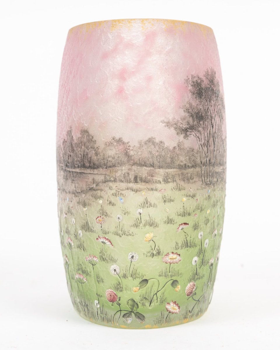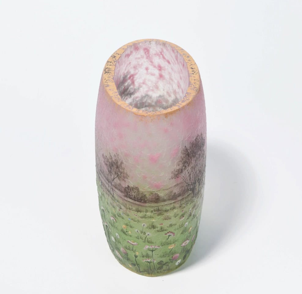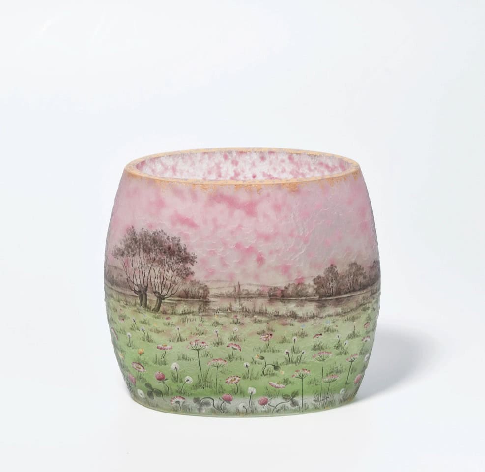 Circa 1905 DAUM – Nancy. « Prairie » Vase de forme ovale méplate à décor gravé en réserve à l’acide et émaillé polychrome d’un paysage de pairie , signé sous la base.
