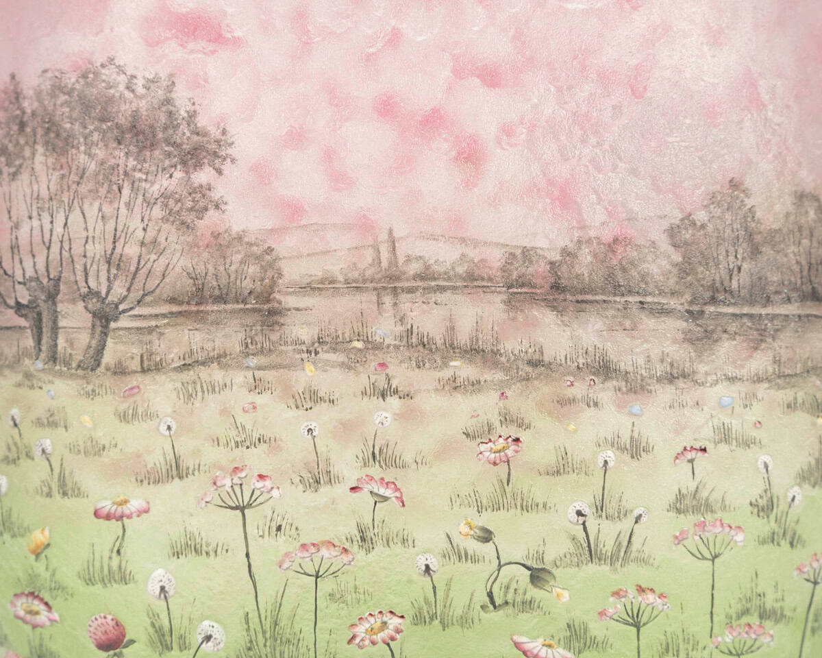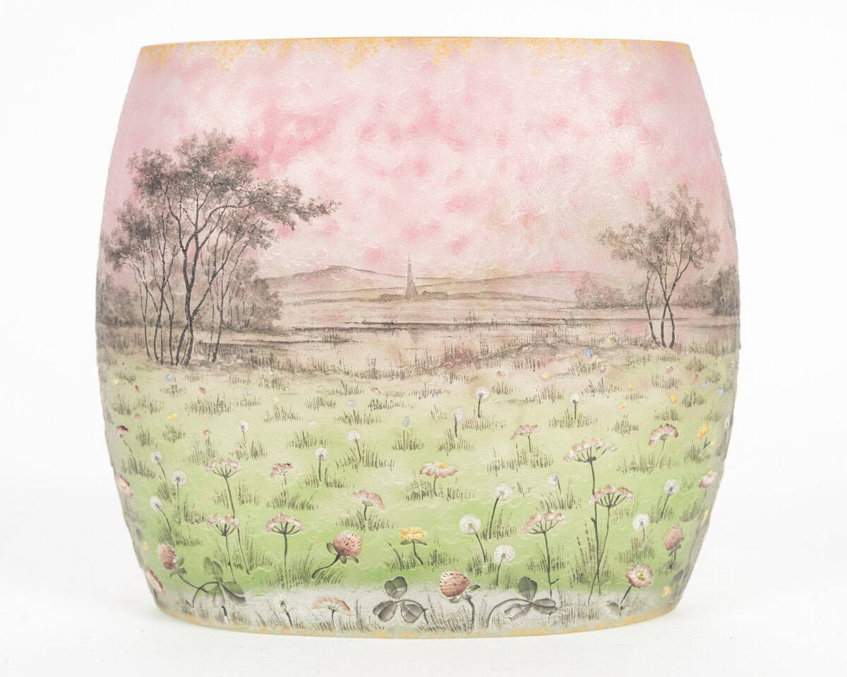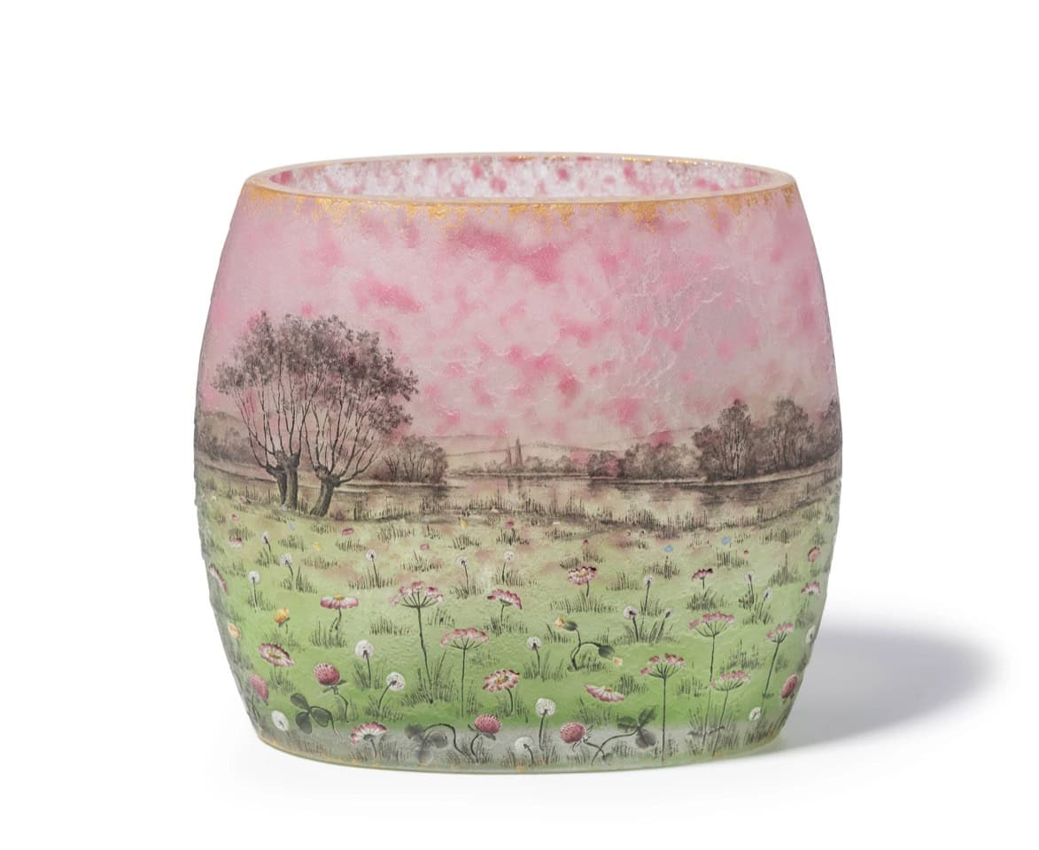 Circa 1905 DAUM – Nancy. « Prairie » Vase de forme ovale méplate à décor gravé en réserve à l’acide et émaillé polychrome d’un paysage de pairie , signé sous la base.