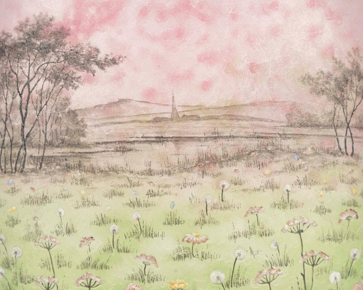 Décor finement émaillé de trèfles en fleurs et fleurs ombellifères dans une prairie au bord d’un vaste paysage dans la douce lumière de l’aube et les arbres peints en noir .