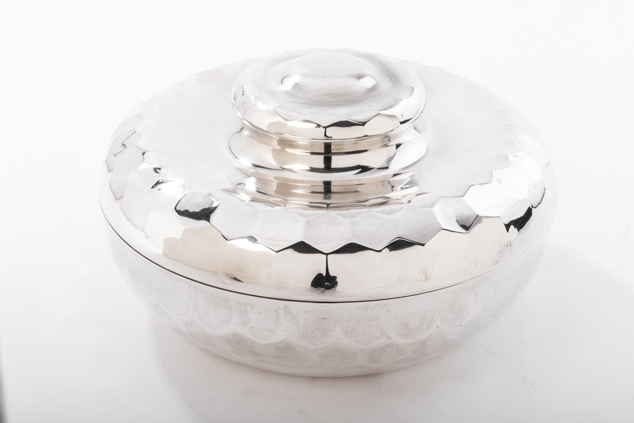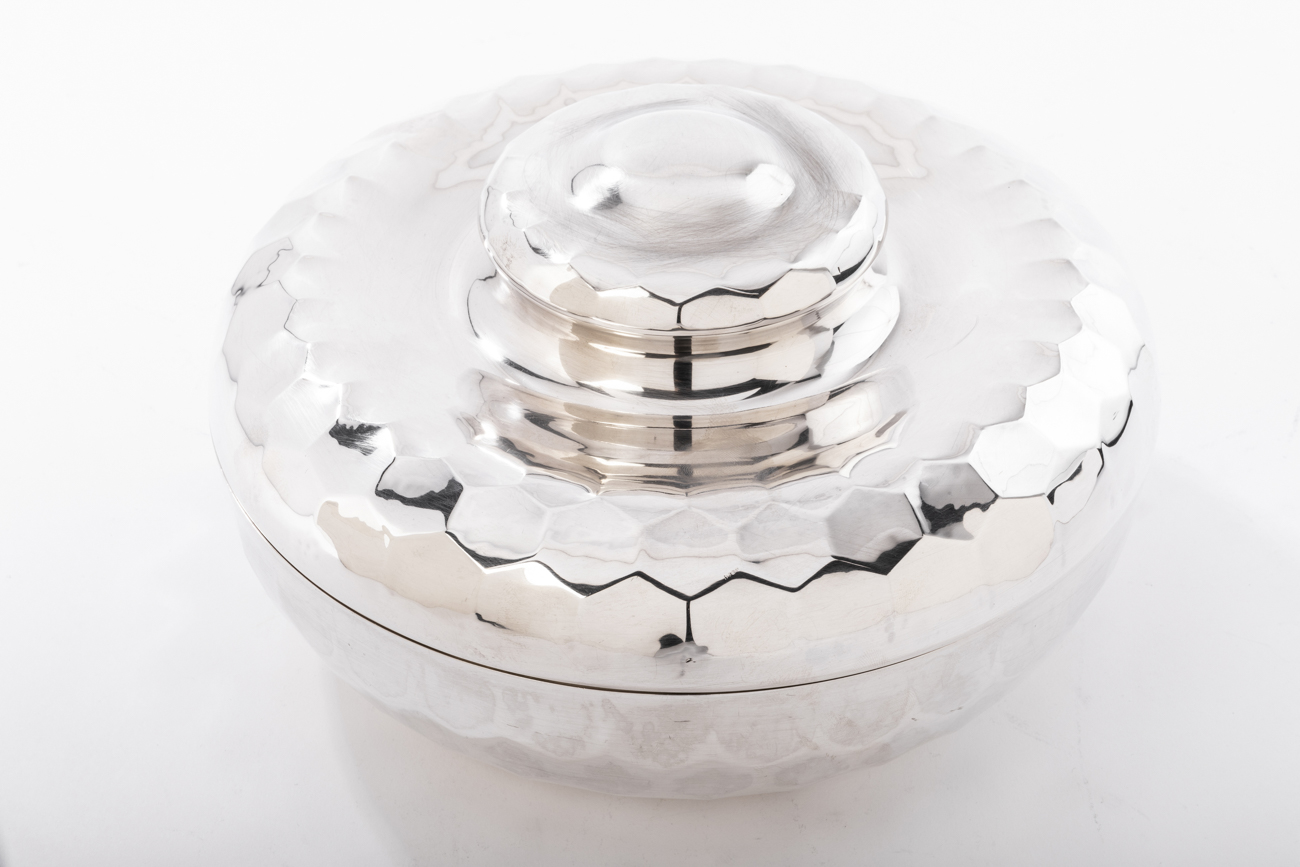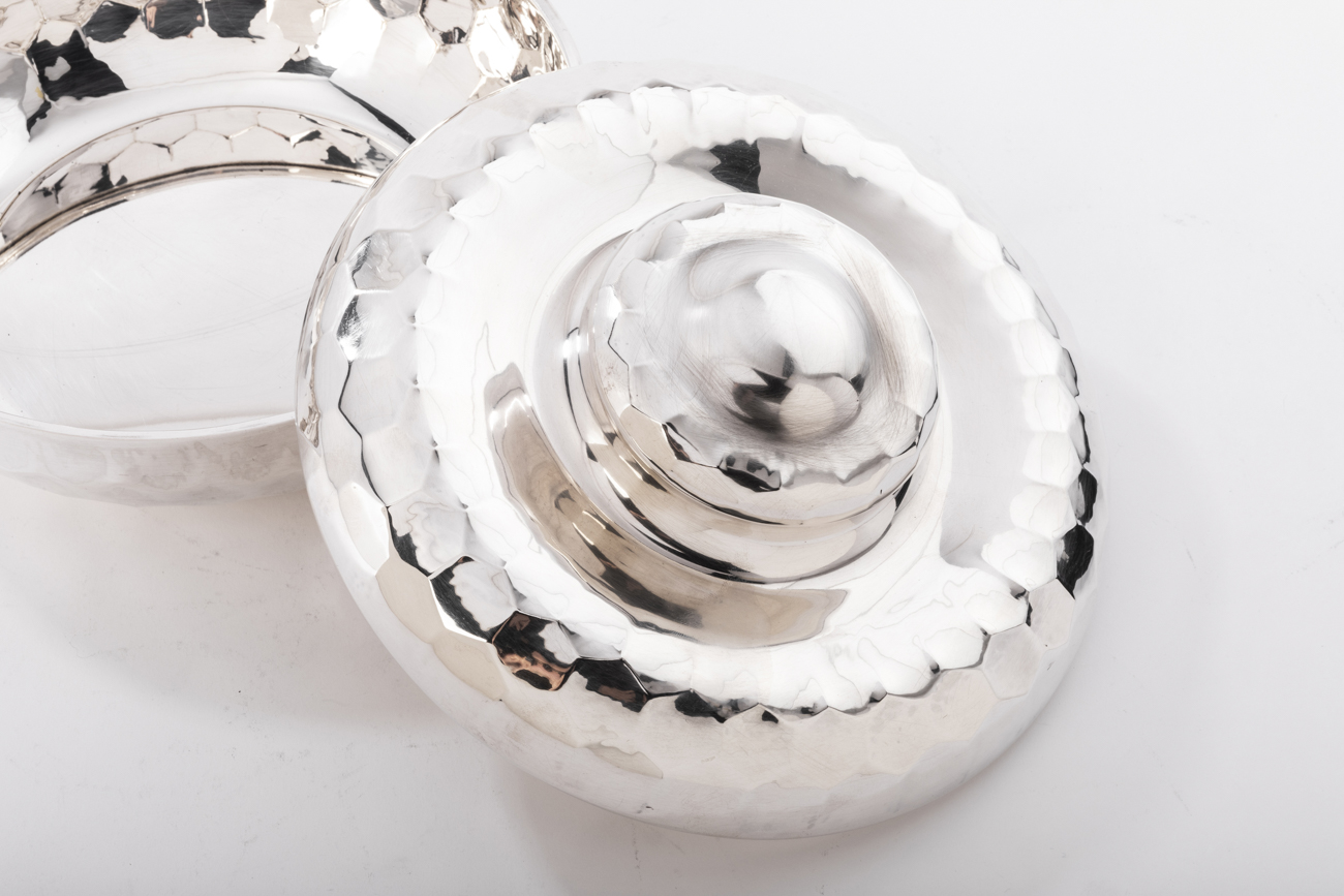 Coffret en argent massif martelé, de forme sphérique, le couvercle est surmonté d’une prise ronde décorée d’un bouton aplati.