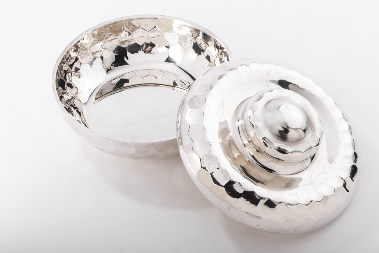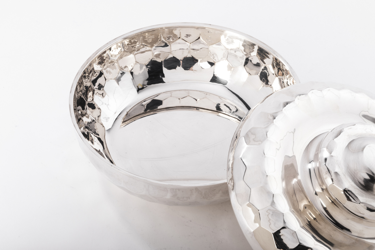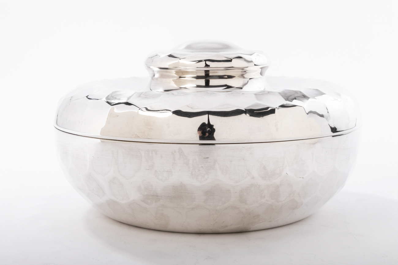 Coffret en argent massif martelé, de forme sphérique, le couvercle est surmonté d’une prise ronde décorée d’un bouton aplati.