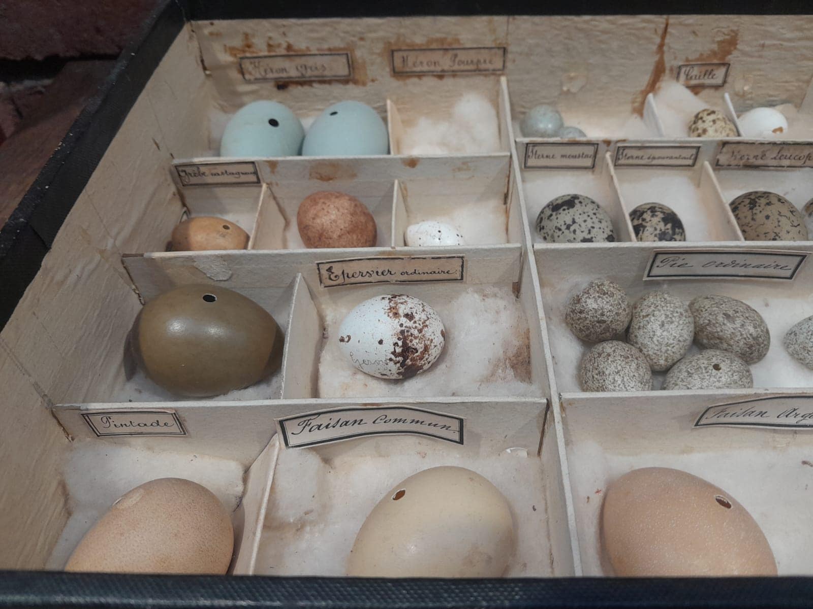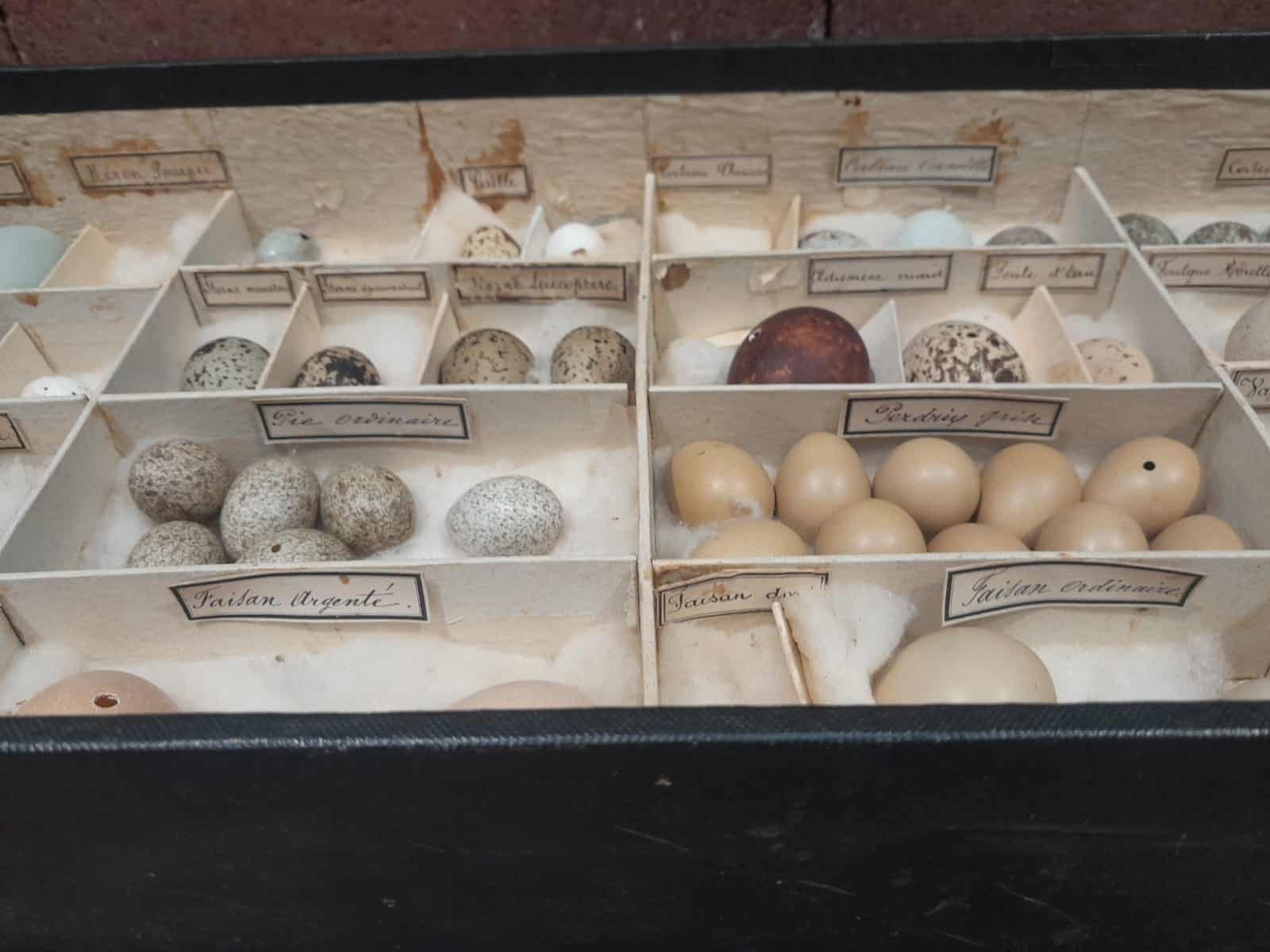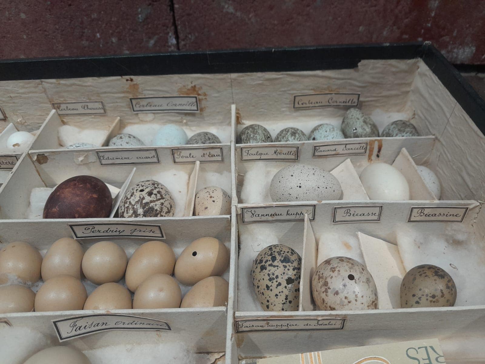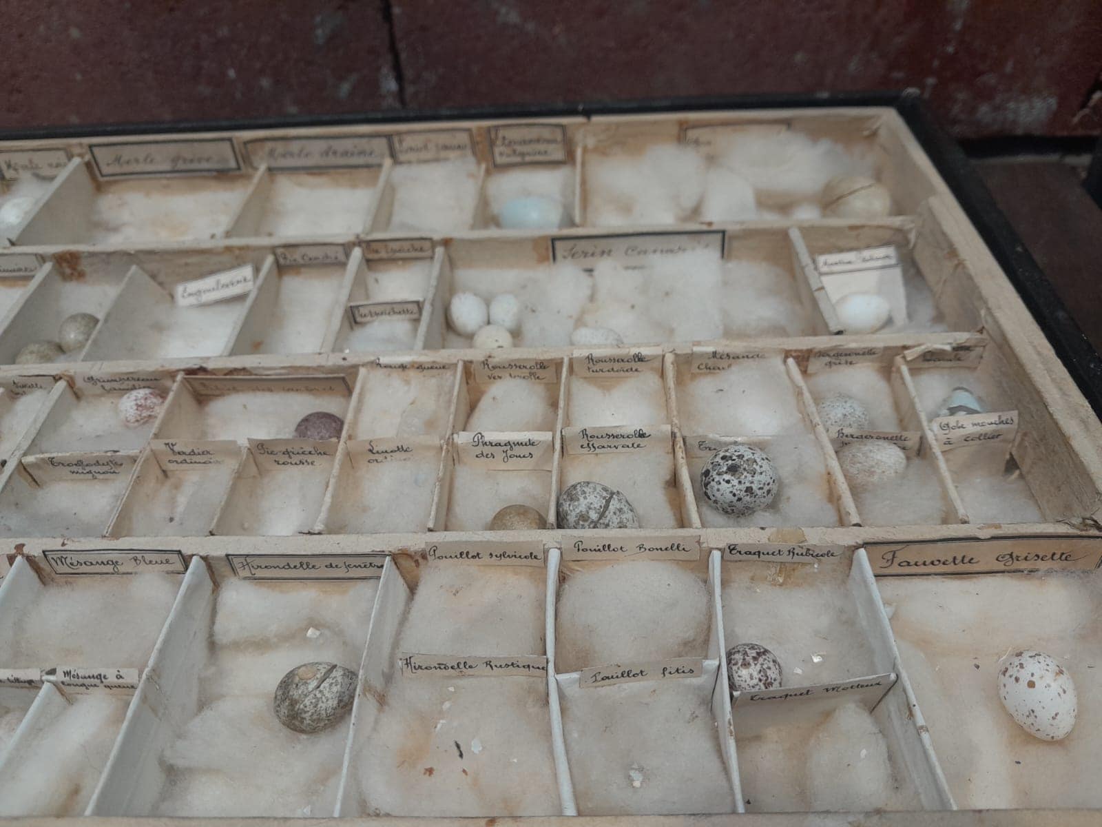 Certains casiers sont vides, dû la fragilité des oeufs, mais 64 espèces d’oiseaux différentes et etiquetées restent intactes.