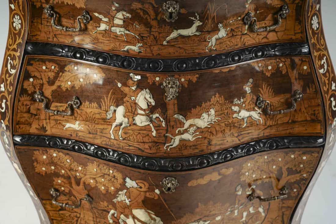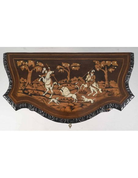 Rare commode lombarde d’entre deux en noyer et marqueterie de bois fruitier, os et nacre. L’ensemble à décor marqueté de scènes de chasse de lion, de cerf, de loup et de sanglier. Elle ouvre en façade galbée et cintrée par trois tiroirs à traverses sculptées. Le dessus de la commode et des tiroirs représentent chacun le type de chasse pratiquée par l’aristocratie.